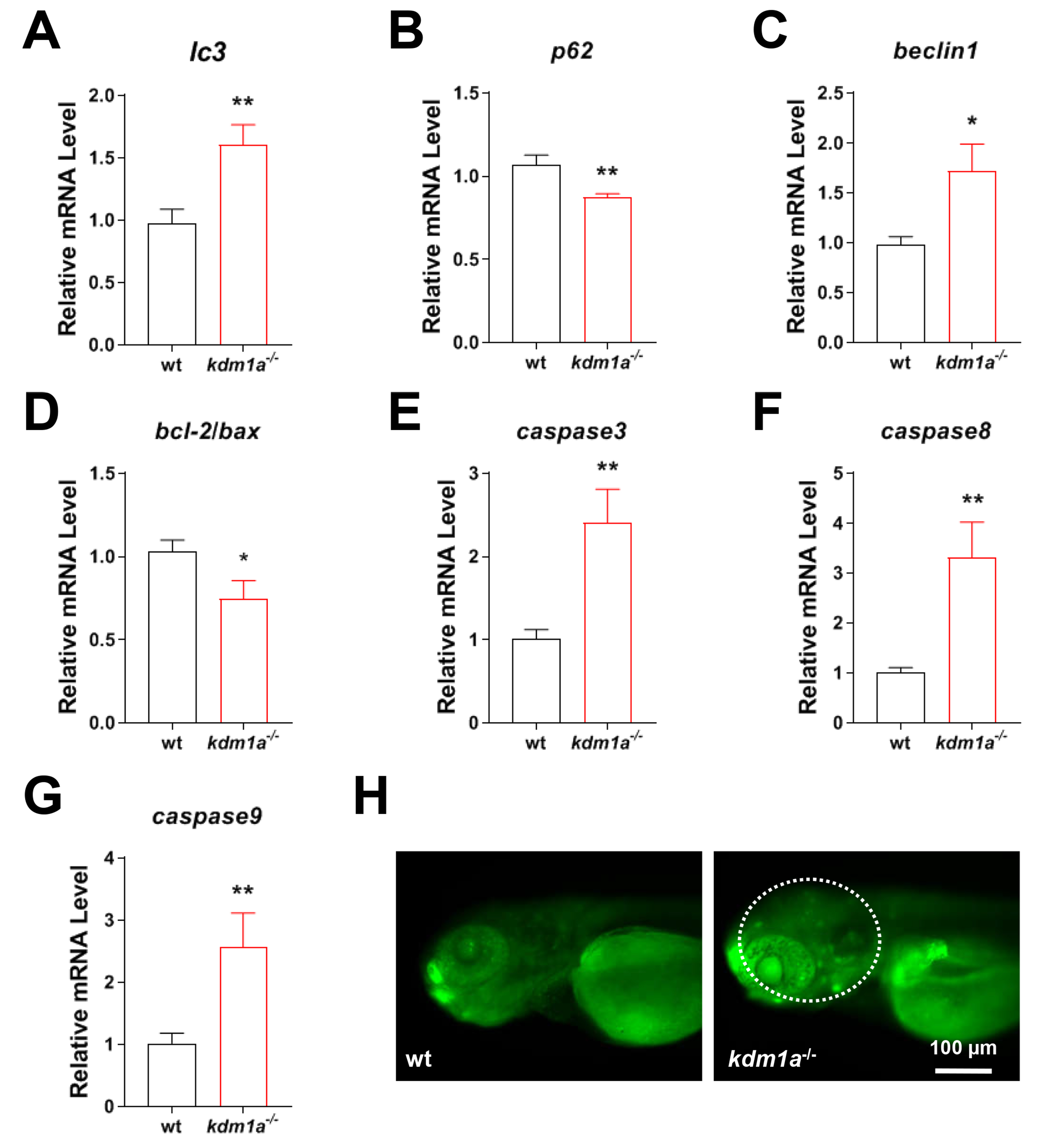 To elucidate the mechanisms of neuronal damage in kdm1a-/- zebrafish, the expression of genes related to autophagy and apoptotic signaling was determined. As shown in Fig. 5A–G, the expression levels of caspase 3, caspase 8, caspase 9, lc3, and beclin1 increased, but the levels of p62 and bcl2/bax decreased in kdm1a-/- zebrafish. Kdm1a deficiency induced marked signs of neuronal apoptosis (Fig. 5H), indicating that loss of kdm1a triggered abnormal autophagy and apoptosis.
