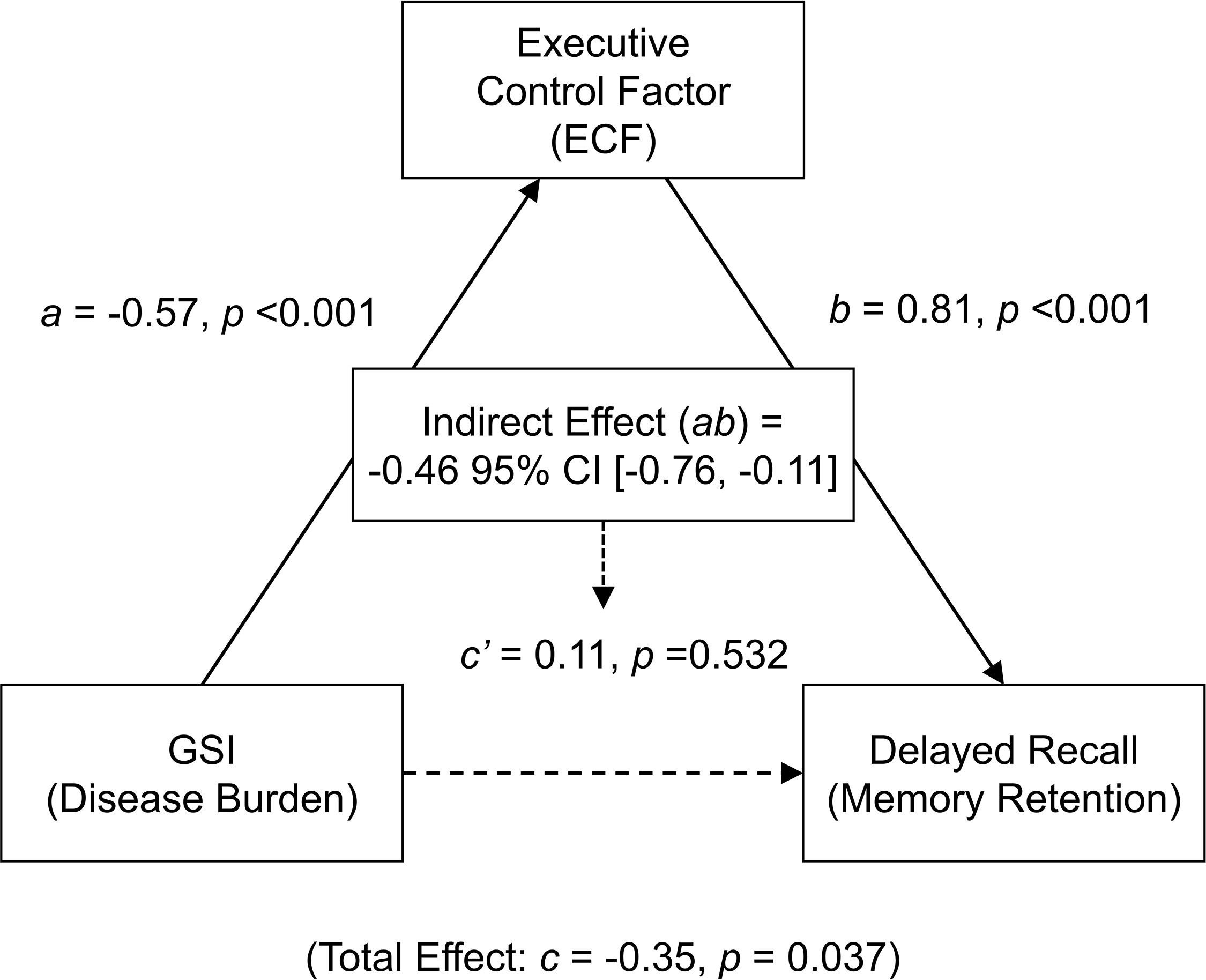 We then tested the hypothesis that this ECF mediates the association between disease burden (GSI) and memory retention (MoCA delayed recall subscore). A mediation analysis was conducted using the PROCESS macro (Version 5.0, Model 4) for SPSS [37], controlling for age, education, BMI, and mood scores. Significance was assessed via bootstrapping with 50,000 resamples.