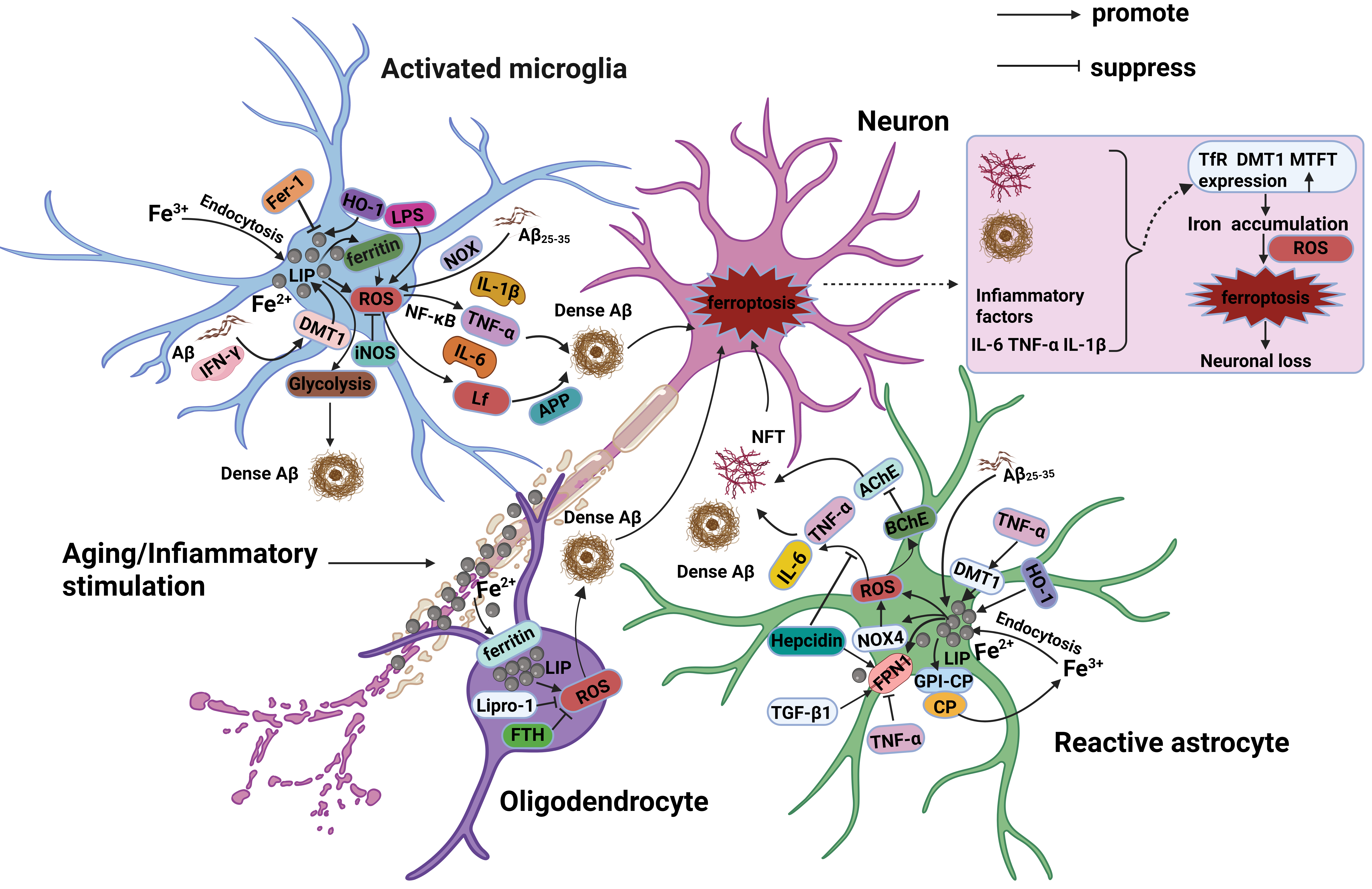 Iron is an essential metal cofactor that plays a vital role in many physiological functions in the body. Various physiological processes are regulated by iron in the brain, including functions that contribute to myelin formation, neurotransmitter synthesis and antioxidant enzymes [1]. Maintaining homeostasis of iron is crucial for maintaining human health, as both iron deficiency and iron overload can be harmful. It has been demonstrated that iron is essential for the normal function of neurons, oligodendrocytes, astrocytes and microglia in the central nervous system (CNS) [2]. Abnormal iron metabolism can increase blood-brain barrier (BBB) permeability and neuroinflammation, promoting neurodegenerative processes [3]. Ferroptosis is a novel type of iron-dependent cell death caused by iron overload, which results in iron-dependent accumulation of lipid peroxides and the production of reactive oxygen species (ROS) [4]. This may be a novel mechanism for inducing neuronal death in neurodegenerative diseases such as Alzheimer’s disease (AD).