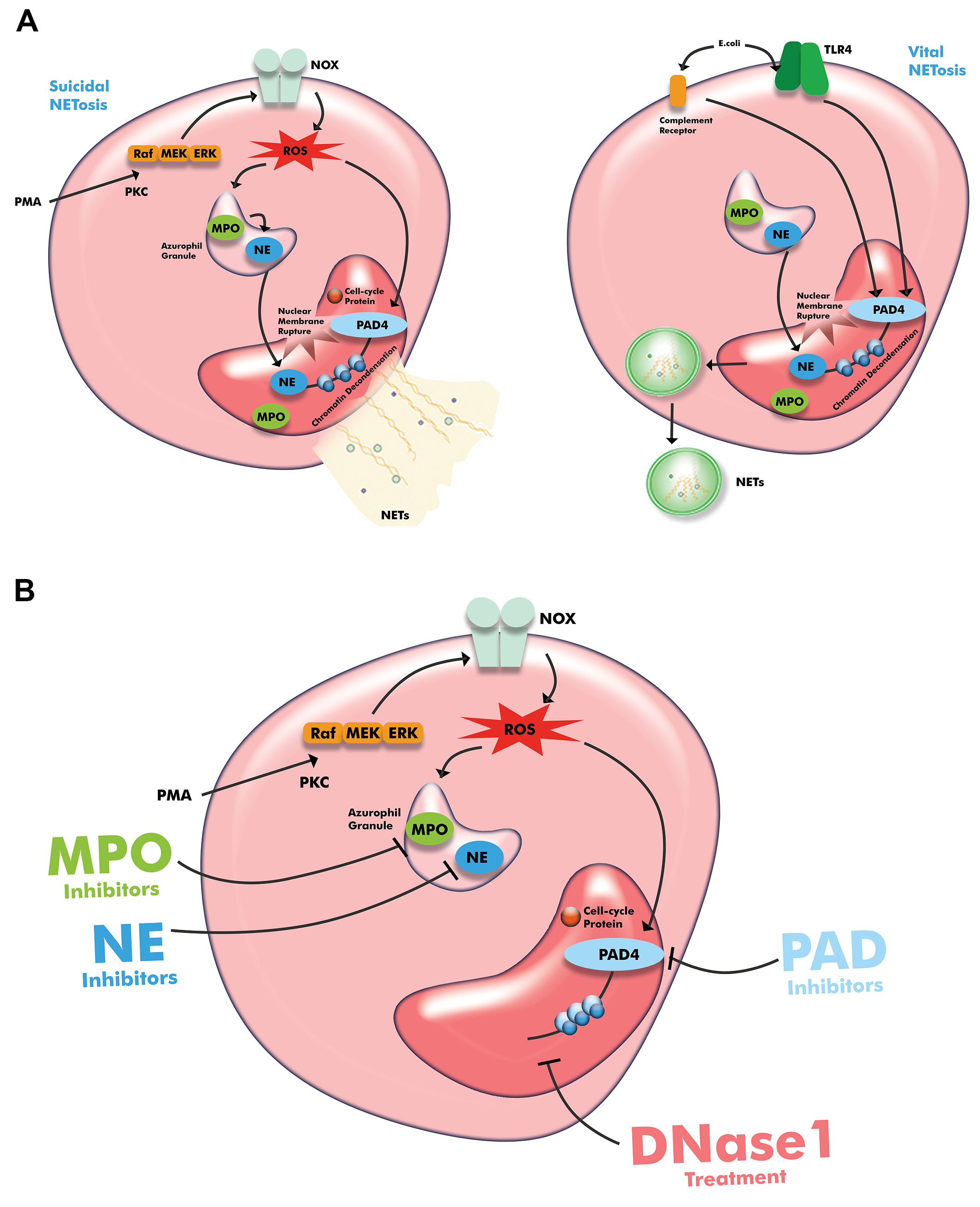 NE and MPO have also been investigated for their effects on NET formation. While both have been identified to play a role in NET formation, MPO has generally been considered only as a marker of NETs [31].
