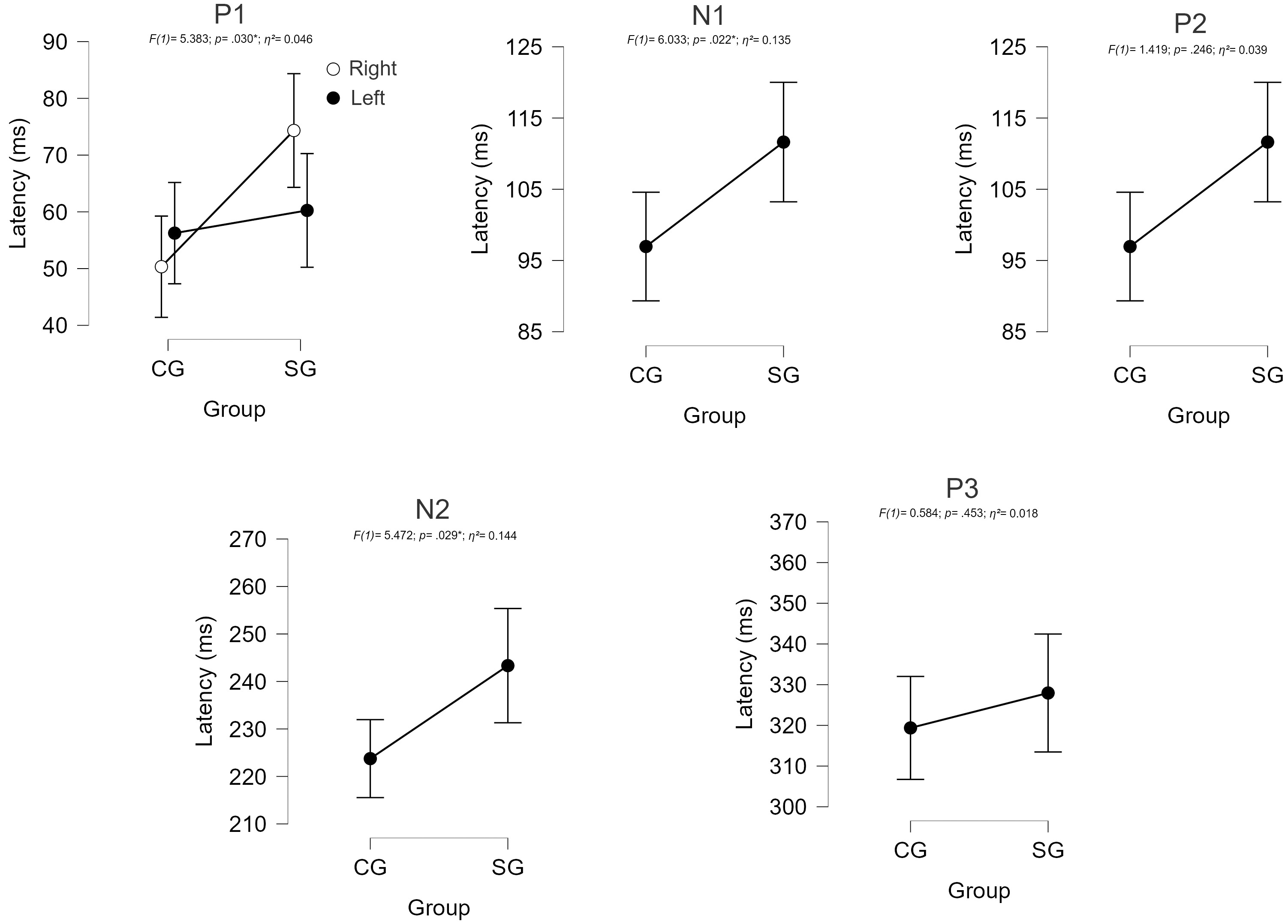 Abnormal ABRs were observed in 33% of the SG and increased I–III interpeak was the most prevalent finding. The CAEPs showed abnormalities in 58% of the SG, mainly to P1 latency. SG subjects presented longer P1, N1, and N2 latencies and lower N2–P3 amplitude. MRI showed alterations mostly in the pons, midbrain, and IV ventricle.