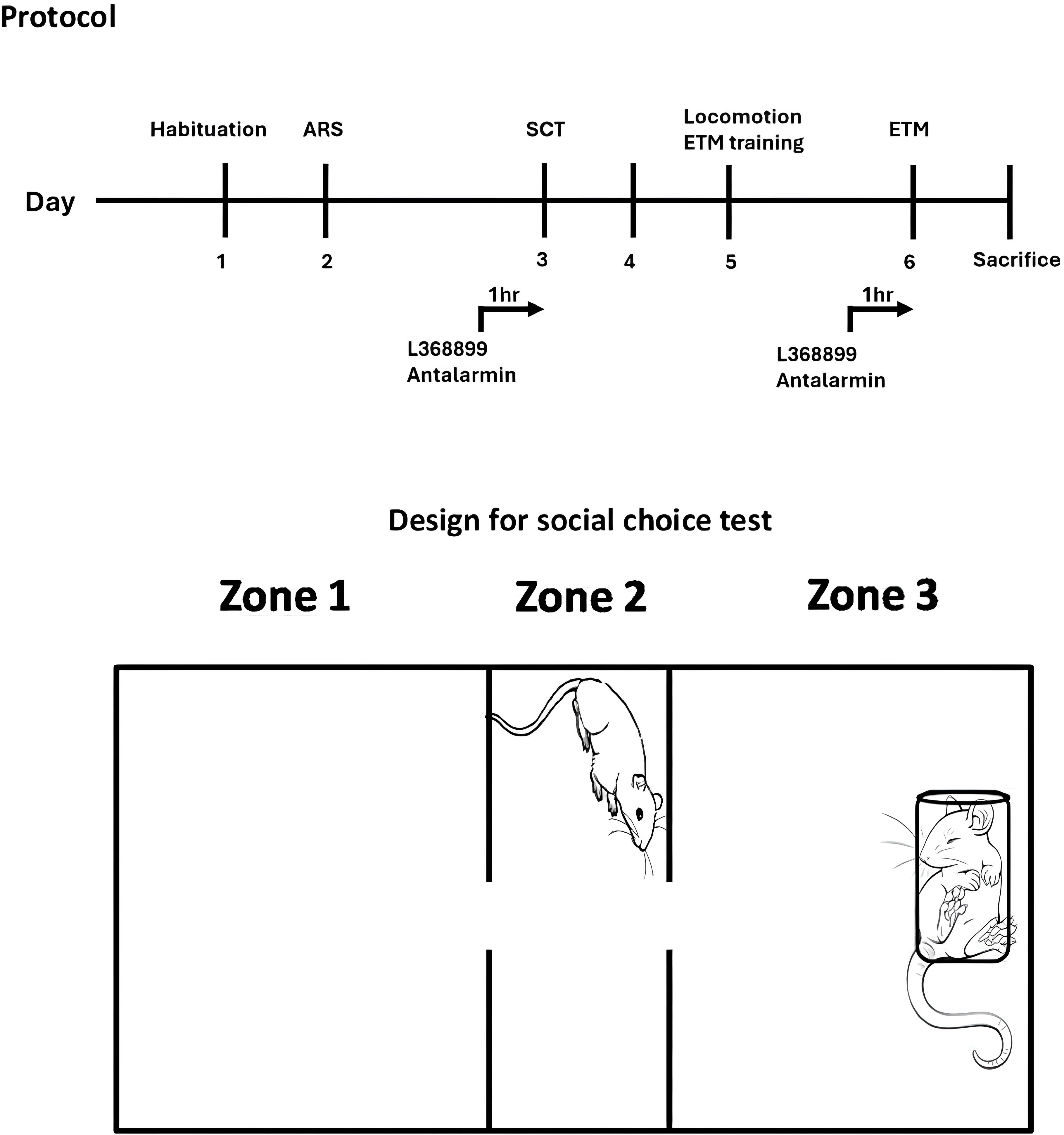 The experimental procedure (the upper half of the figure) and the design of social choice test (SCT). L-368899 (5 mg per kg, i.p.) or Antalarmin (20 mg per kg, i.p.) was administered 1 hour before SCT and ETM. Tissue levels of 5-HT, DA and NE in the hippocampus, mPFC, as well as amygdala were measured after sacrifice. ARS, acute restraint stress; ETM, elevated T maze; mPFC, medial prefrontal cortex; 5-HT, serotonin; DA, dopamine; NE, norepinephrine.