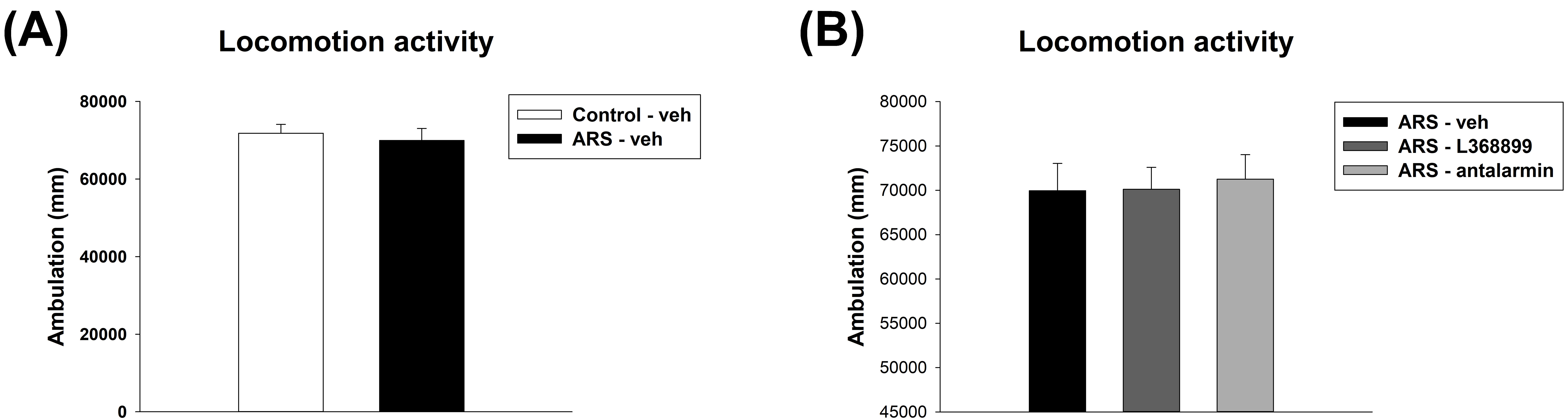 locomotor activity among ARS-veh, ARS-L368899, and ARS-antalarmin groups. The