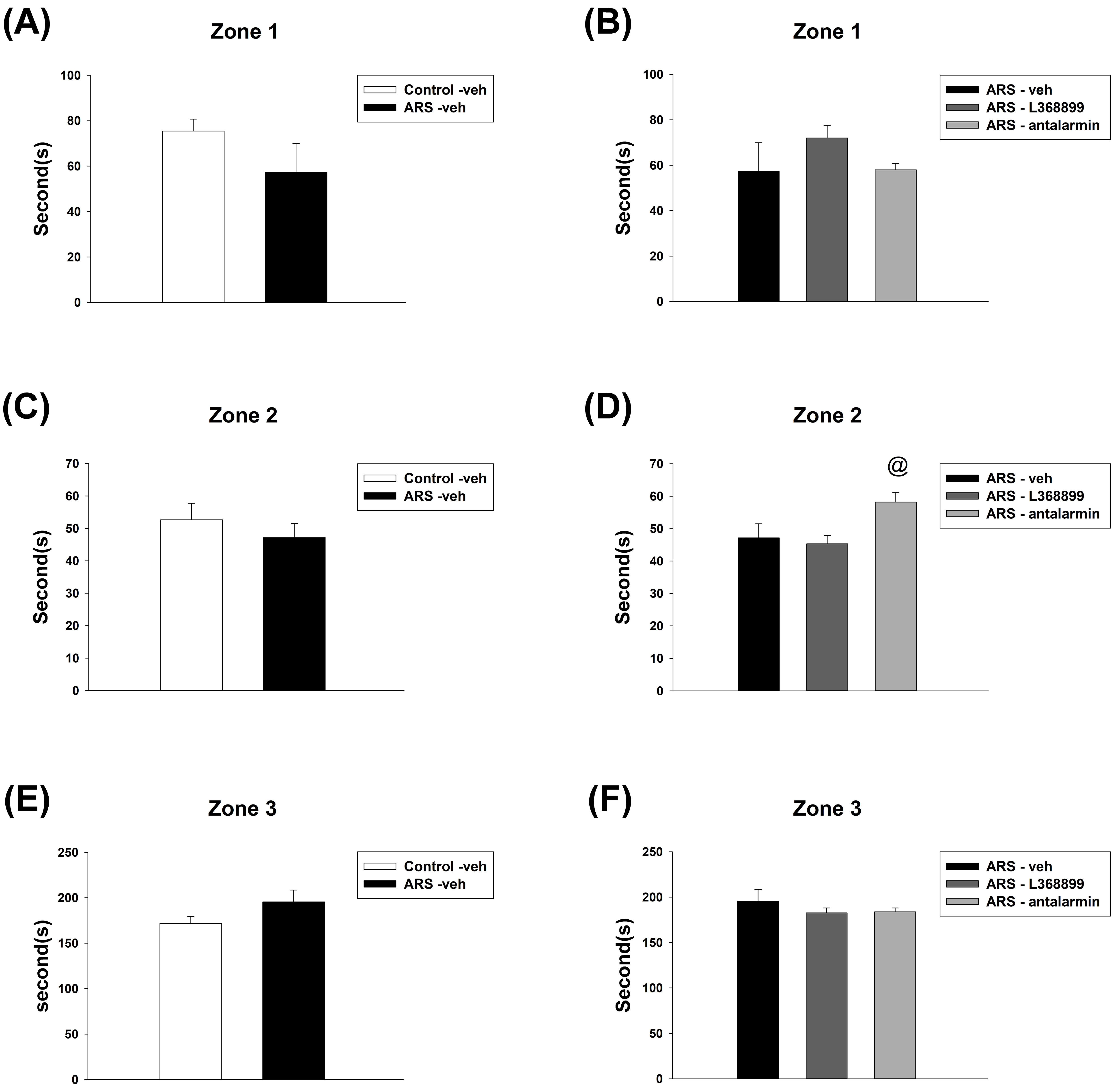 ARS-veh, ARS-L368899, and ARS-antalarmin groups. The time spent in zones 3 (E)
