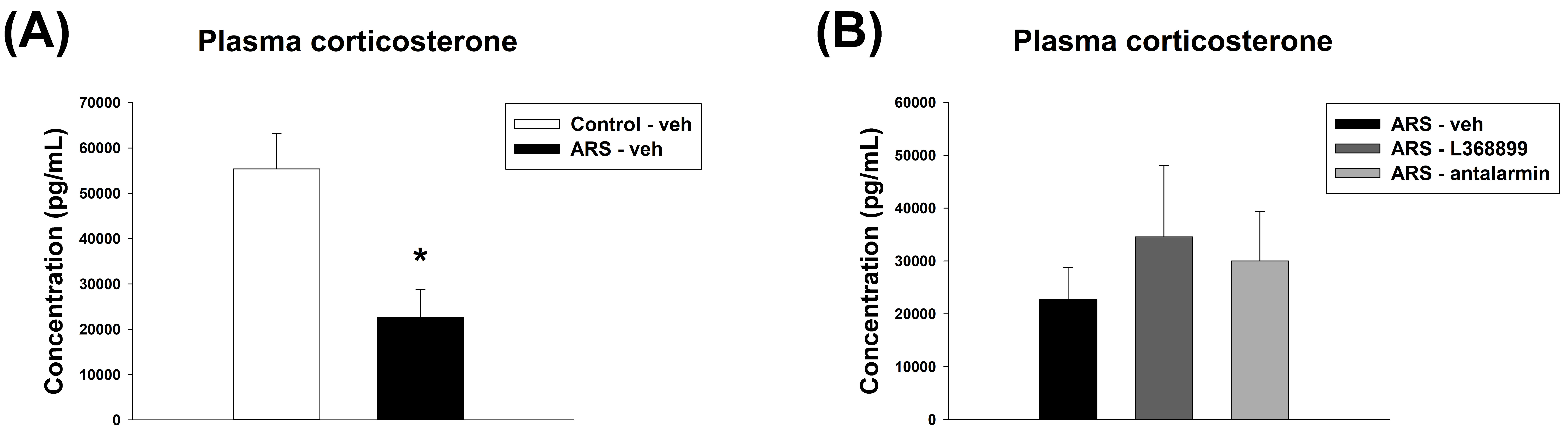 plasma corticosterone level (A) between the Control-veh and the ARS-veh groups