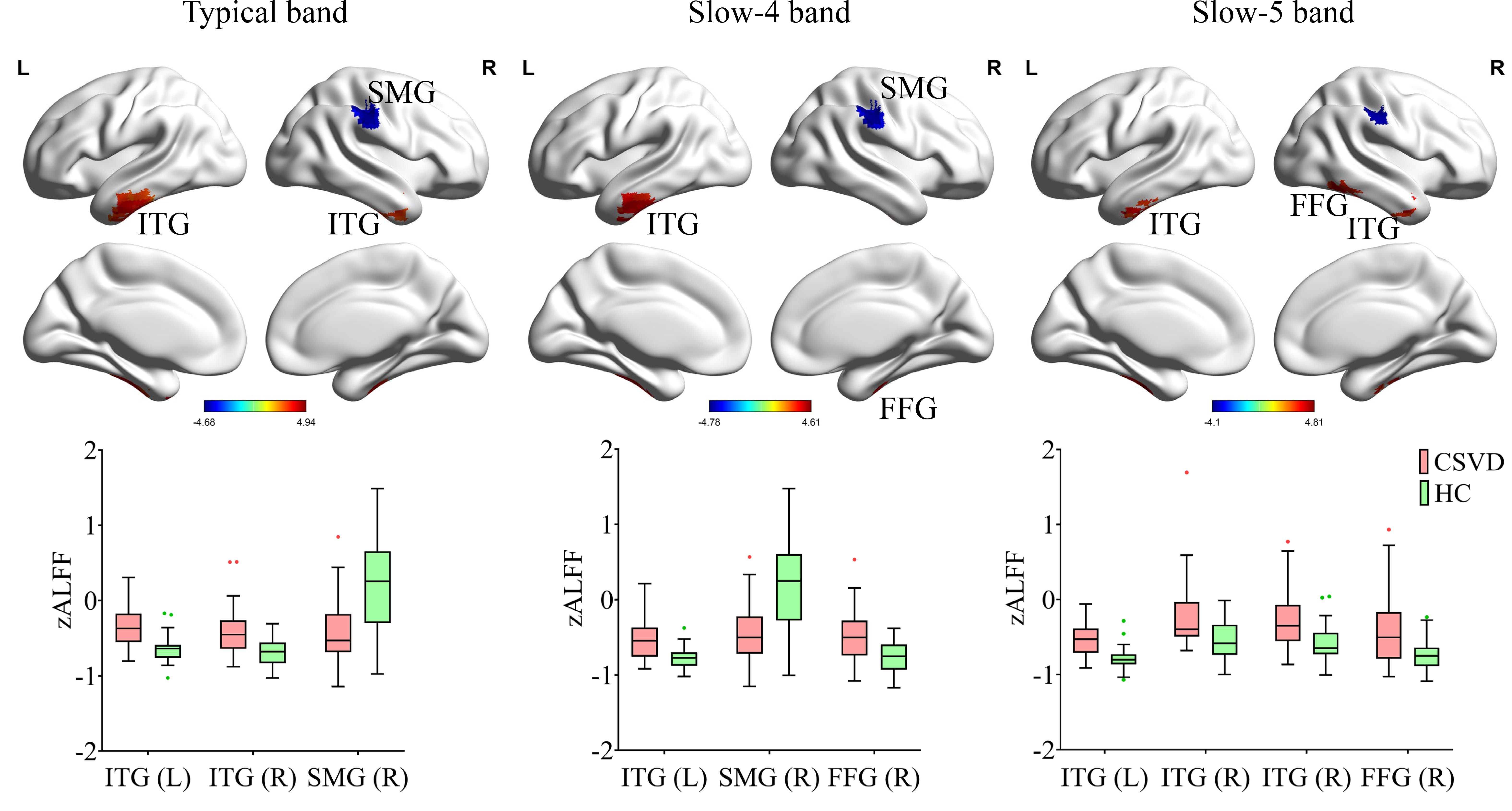 In the typical band, the CSVD group exhibited decreased ALFF in the right