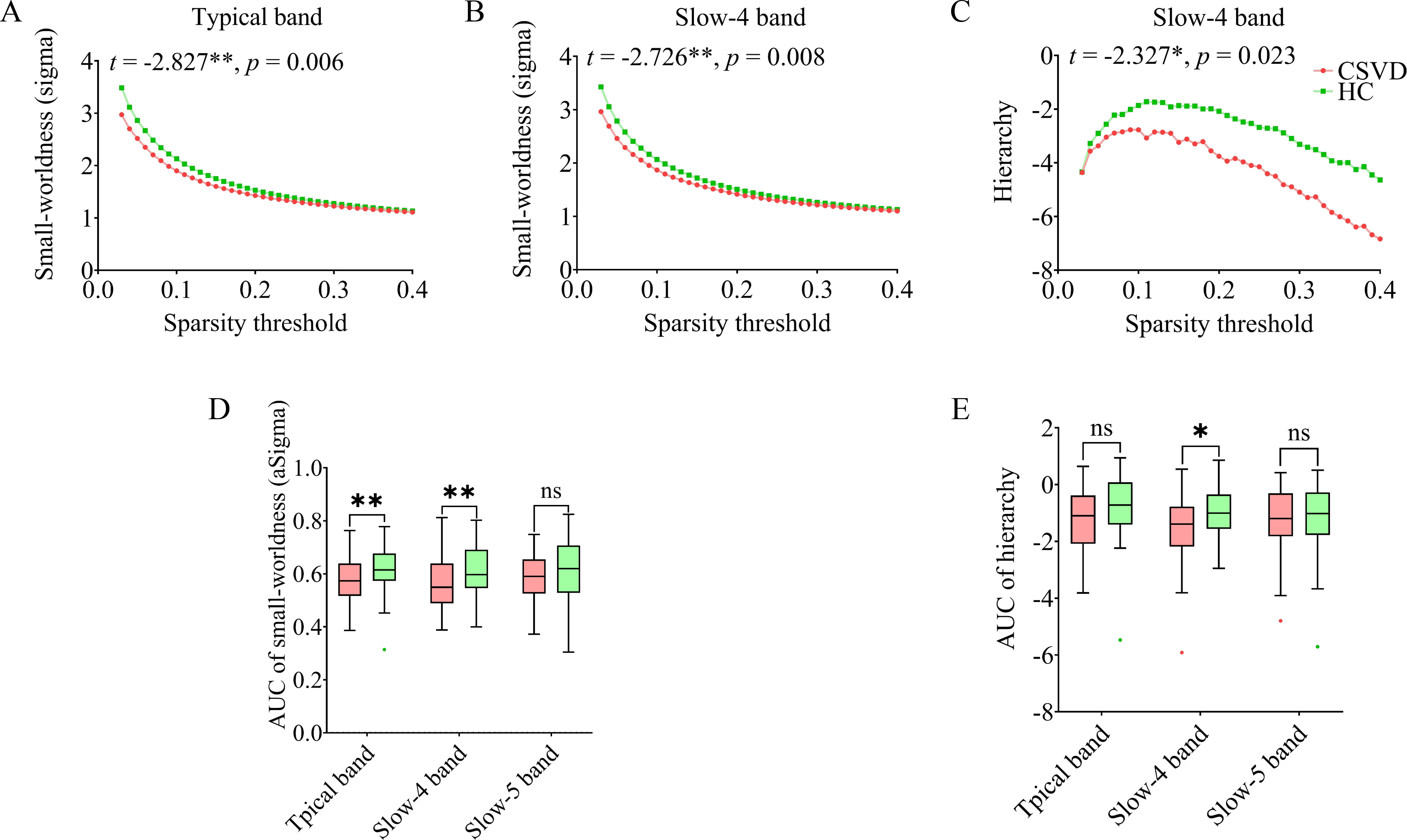 the slow-4 band. The overall AUC value for (D) small-worldness and (E) hierarchy