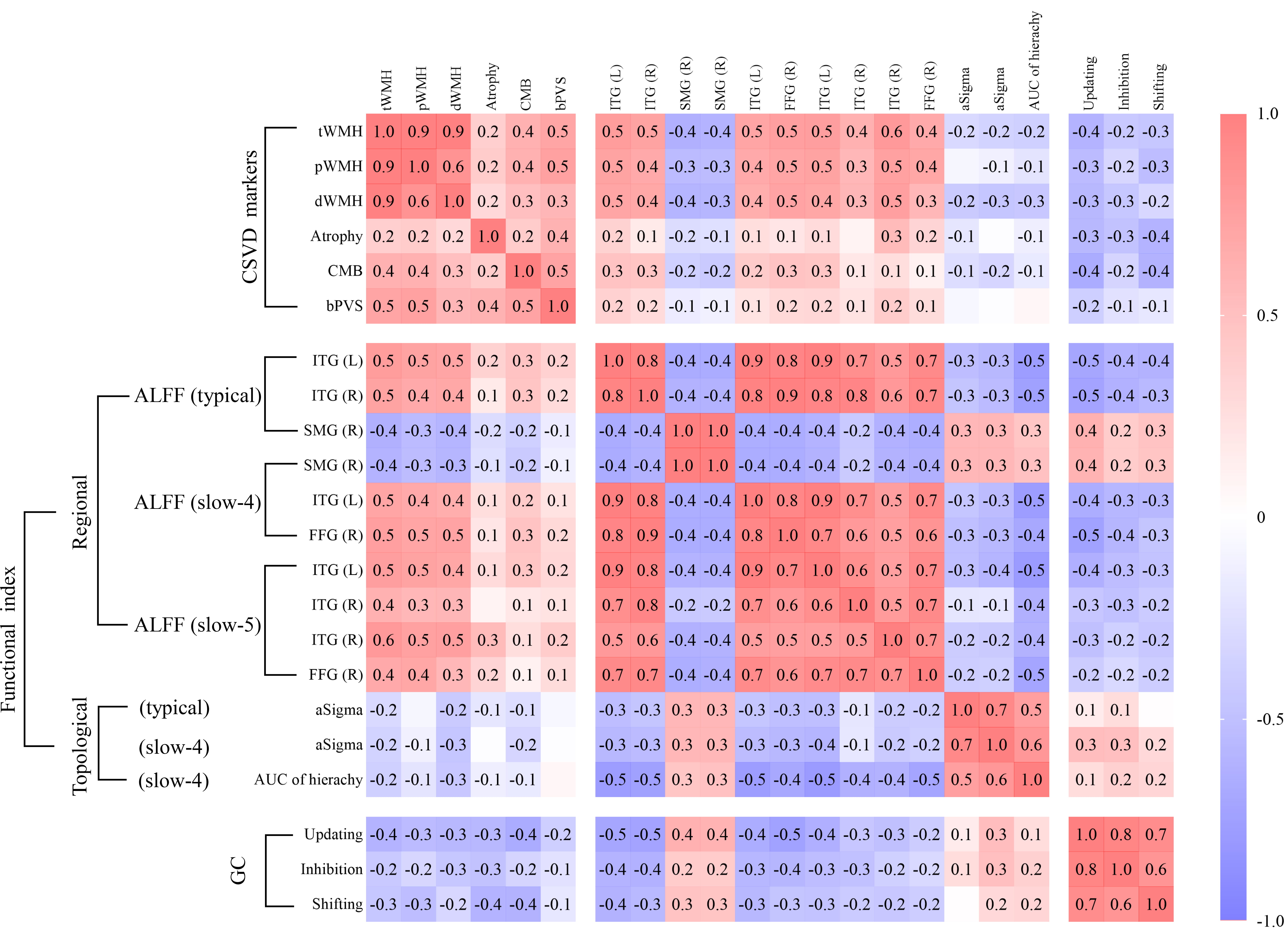 Significant group differences were identified in three categories of measures through independent sample t-tests: (1) CSVD markers (tWMH, pWMH, dWMH, brain atrophy, CMB, bPVS), (2) functional indicators (ALFF in three frequency bands, aSigma in the typical and slow-4 band, AUC of hierarchy in the slow-4 band), and (3) global cognition (updating, inhibition, shifting). These measures were subsequently included in pairwise correlation analyses. The correlation coefficient matrix for all participants is presented in Fig. 4, with detailed coefficients and corresponding p-values provided in Supplementary Tables 2–4. Supplementary Table 2 displays correlations between CSVD markers and functional indicators, Supplementary Table 3 displays correlations between CSVD markers and cognitive performance, and Supplementary Table 4 displays correlations between functional indicators and cognitive performance. Scatter plots with fitted regression lines are shown in Supplementary Fig. 4, while the correlation matrix specific to the CSVD patients is presented in Supplementary Fig. 5. These findings suggest a close relationship among WMHs (tWMH, dWMH, pWMH), ALFF across the three frequency bands, and cognitive performance, as well as dWMH, aSigma in the slow-4 band, and cognitive performance.
