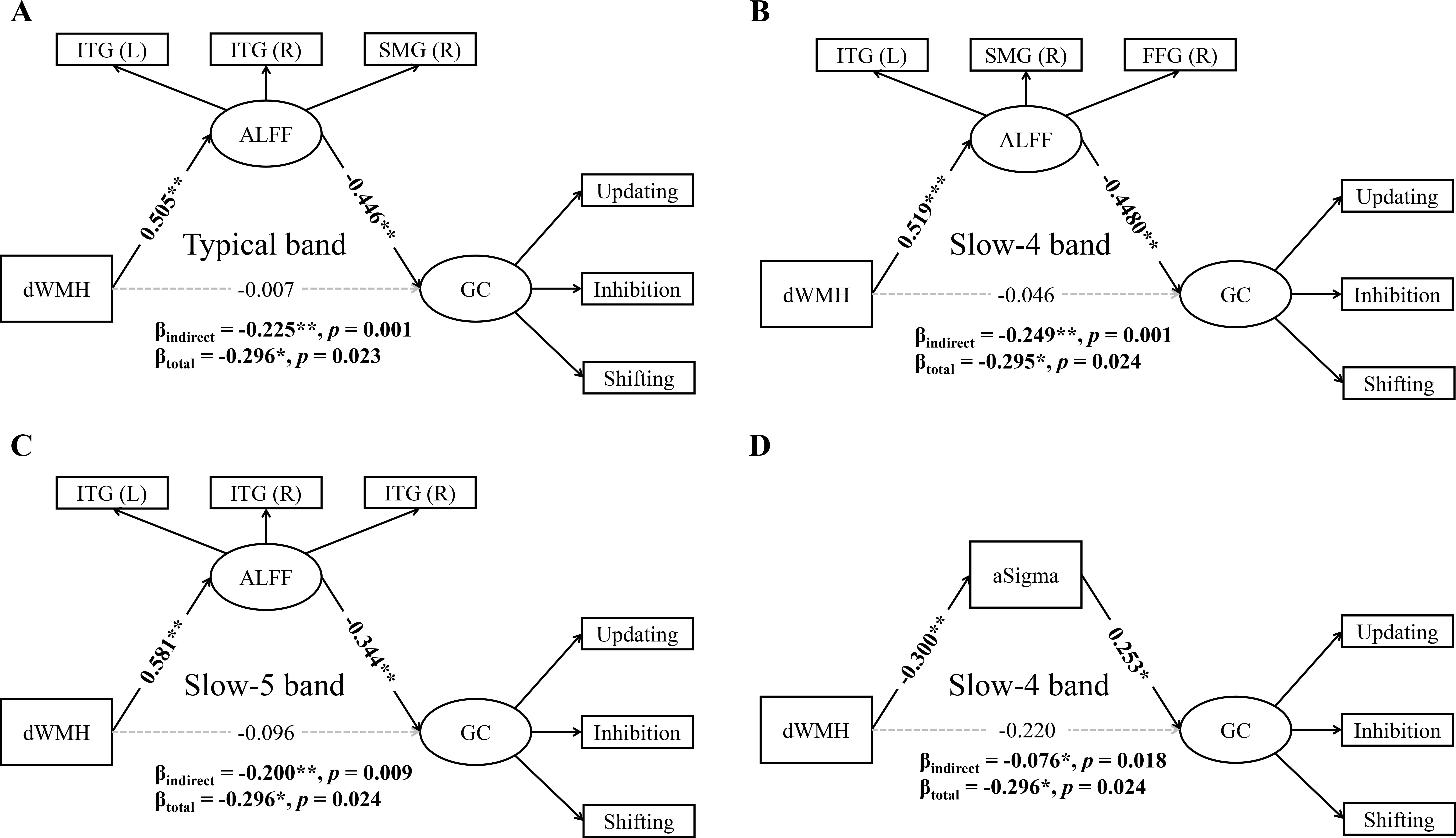 Based on hypotheses 1–2, we constructed four simple mediation models (Supplementary Fig. 1): (1) ALFF (typical/slow-4/slow-5 band) mediating tWMH/pWMH/dWMH-GC (Supplementary Fig. 1A); (2) WMH (tWMH/pWMH/dWMH) mediating ALFF (typical/slow-4/slow-5 band)-GC (Supplementary Fig. 1B); (3) aSigma (slow-4) mediating dWMH-GC (Supplementary Fig. 1C); (4) dWMH mediating aSigma (slow-4)-GC (Supplementary Fig. 1D).