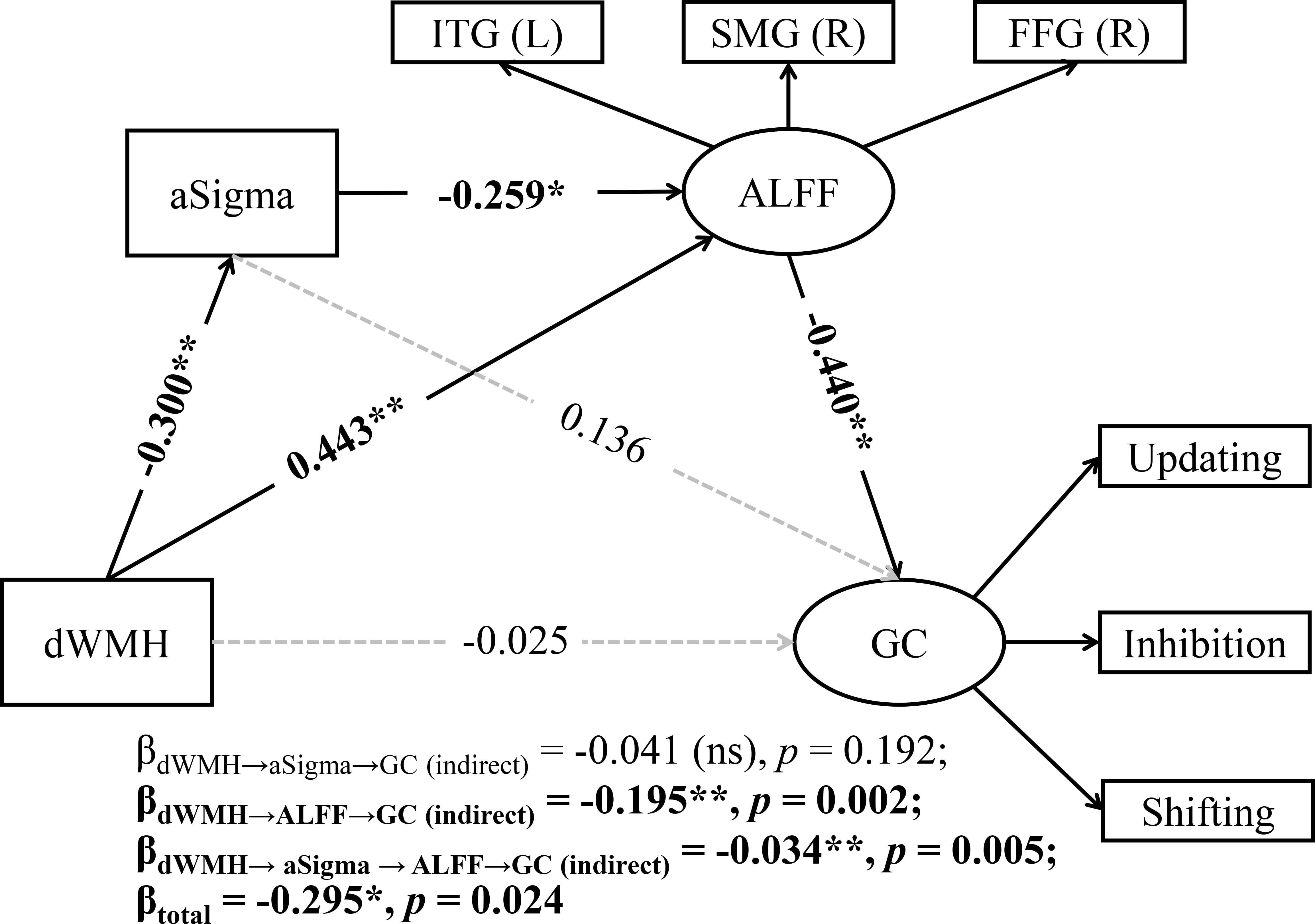 mediates the WMH-GC relationship (alternative: WMH mediates ALFF-GC); (2) aSigma