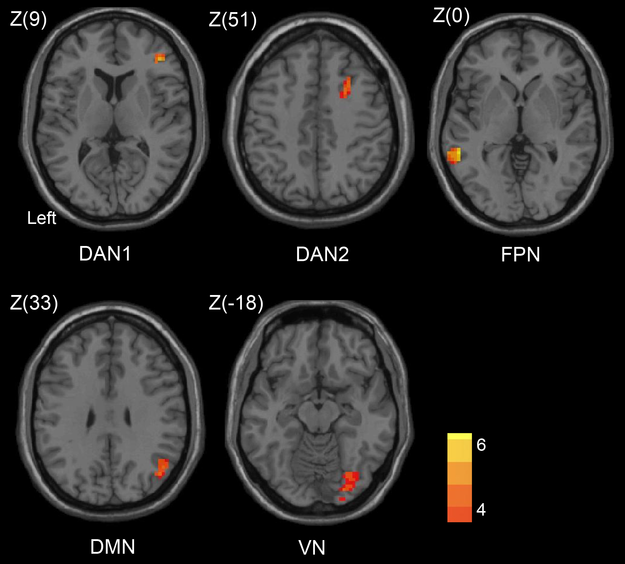 a symmetrical shape, particularly in the DMN, similar to manifestations observed