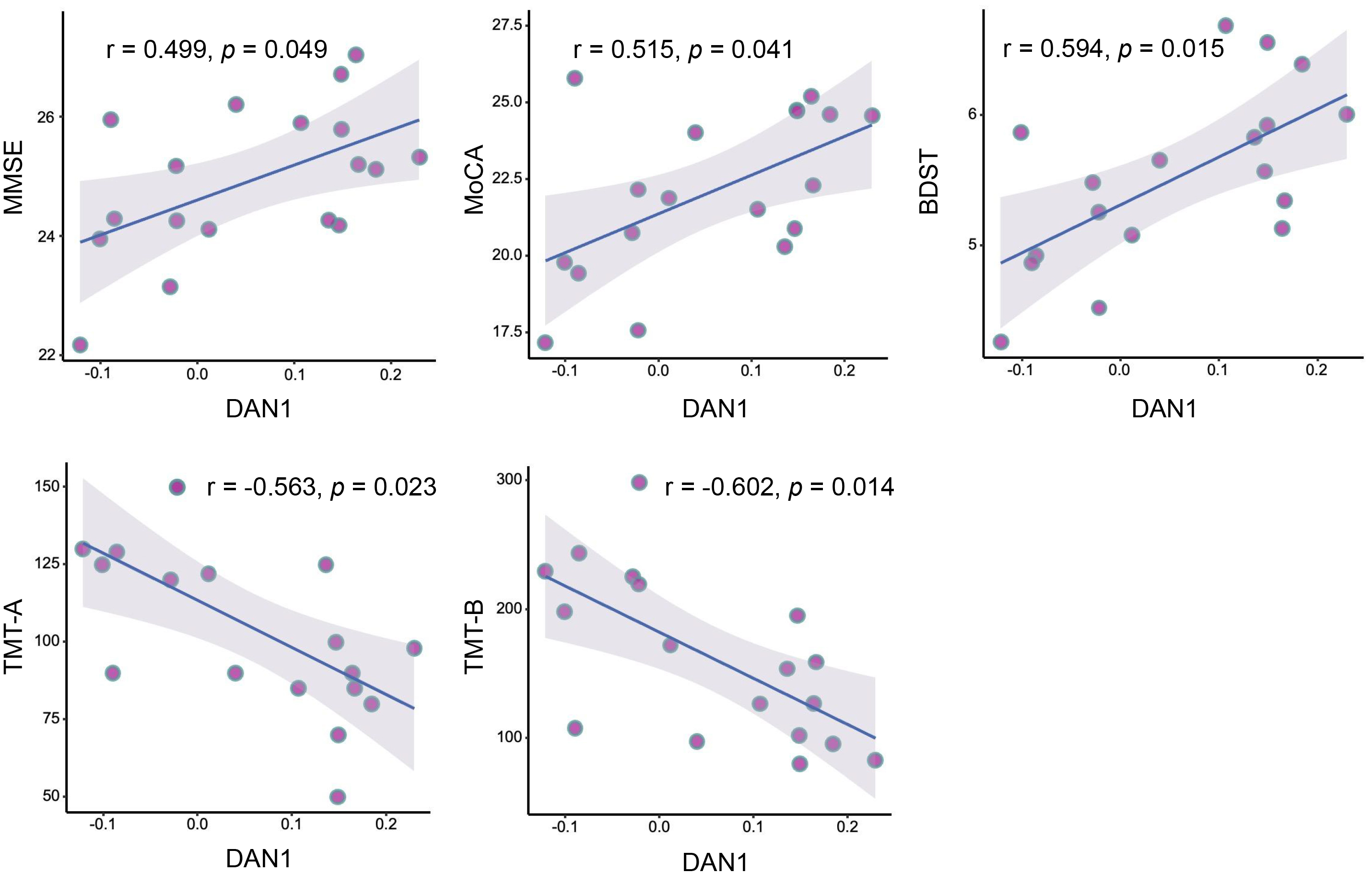 We further assessed the correlation between FC changes and cognitive function, revealed: a positively correlation between a reduction in DAN with frontal pole (ipsilateral to occlusion) and the total score of MMSE (r = 0.499, p = 0.049), MoCA (r = 0.515, p = 0.041), BDST (r = 0.594, p = 0.015); and a negative association with TMT-A (r = –0.563, p = 0.023) and TMT-B scores (r = –0.602, p = 0.014) (Fig. 3).