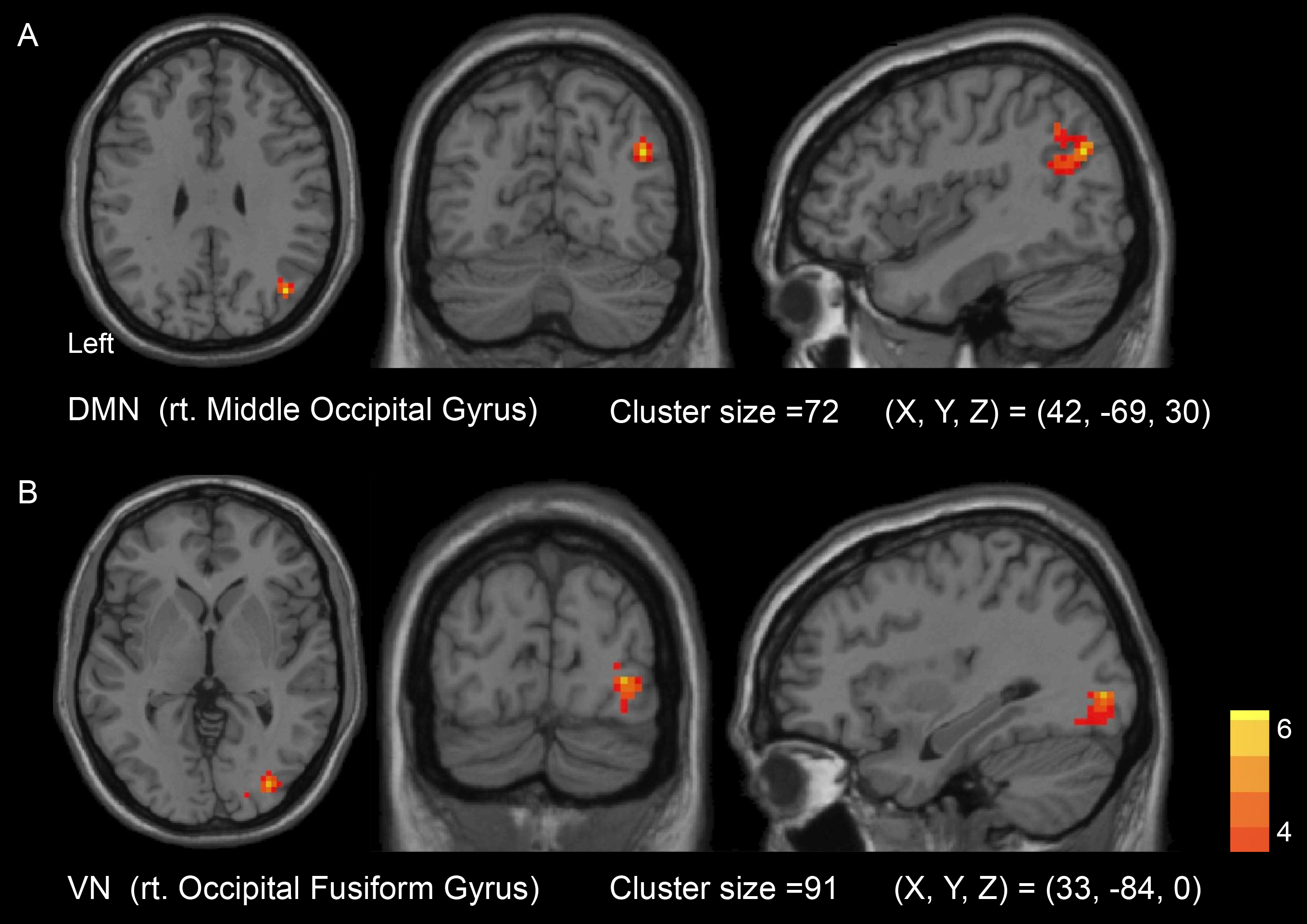 strengths in DMN with right Middle Occipital Gyrus (A) and VN with right