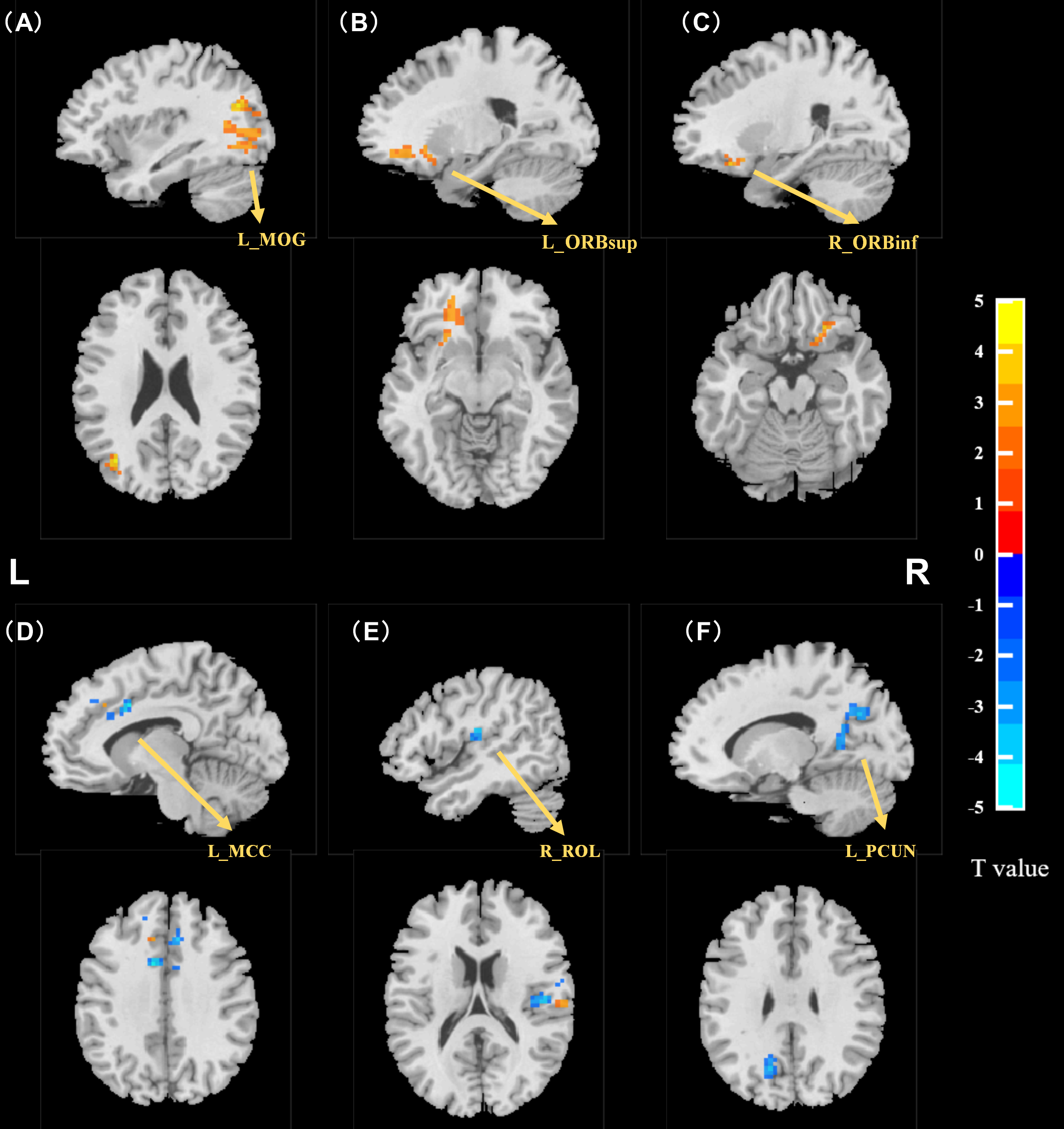MOG, middle occipital gyrus; ORBsup, superior frontal gyrus orbital part; ORBinf, inferior frontal gyrus orbital part; MCC, median cingulate and paracingulate gyri; PCUN, precuneus; ROL, rolandic operculum; MNI, Montreal Neurological Institute; zALFF, z-scored amplitude of low-frequency fluctuation.