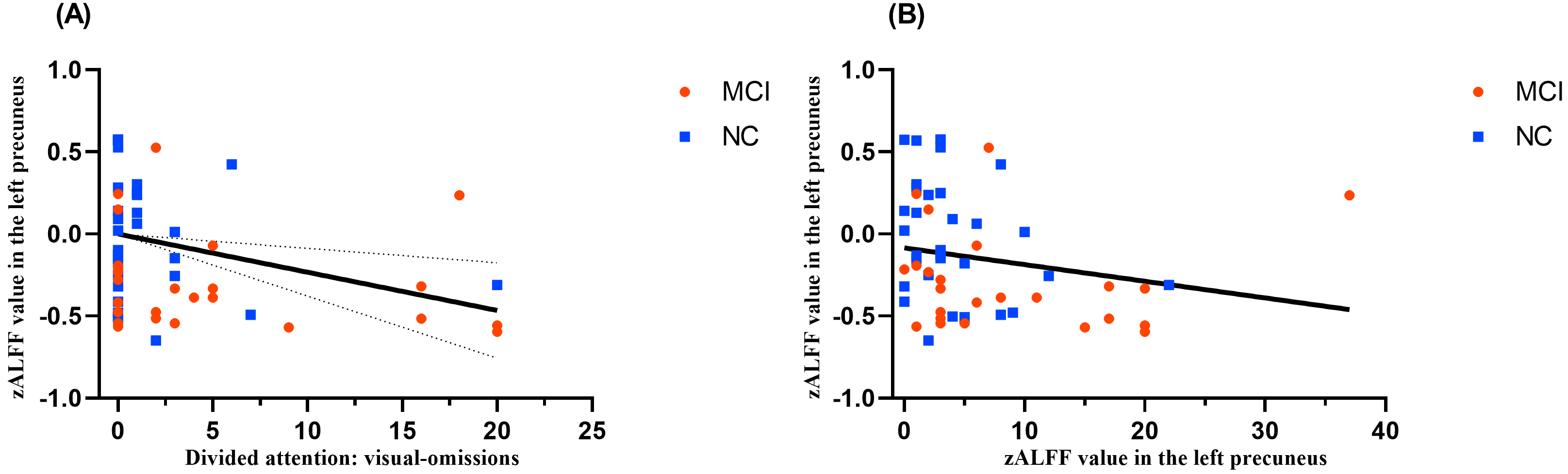 There were significant differences in omissions of intrinsic alertness, total omissions of divided attention, omissions and correct of visual divided attention between the two groups. Meanwhile, independent sample t-tests indicated that the MCI group exhibited higher z-scored ALFF (zALFF) in the left middle occipital gyrus, left superior frontal gyrus (orbital part), and right inferior frontal gyrus (orbital part) when compared with the NC group. The MCI group exhibited reduced zALFF in the left median cingulate and paracingulate gyrus, left precuneus, and right rolandic operculum. Notably, the decreased zALFF in the left precuneus showed a significant negative correlation with divided attention.