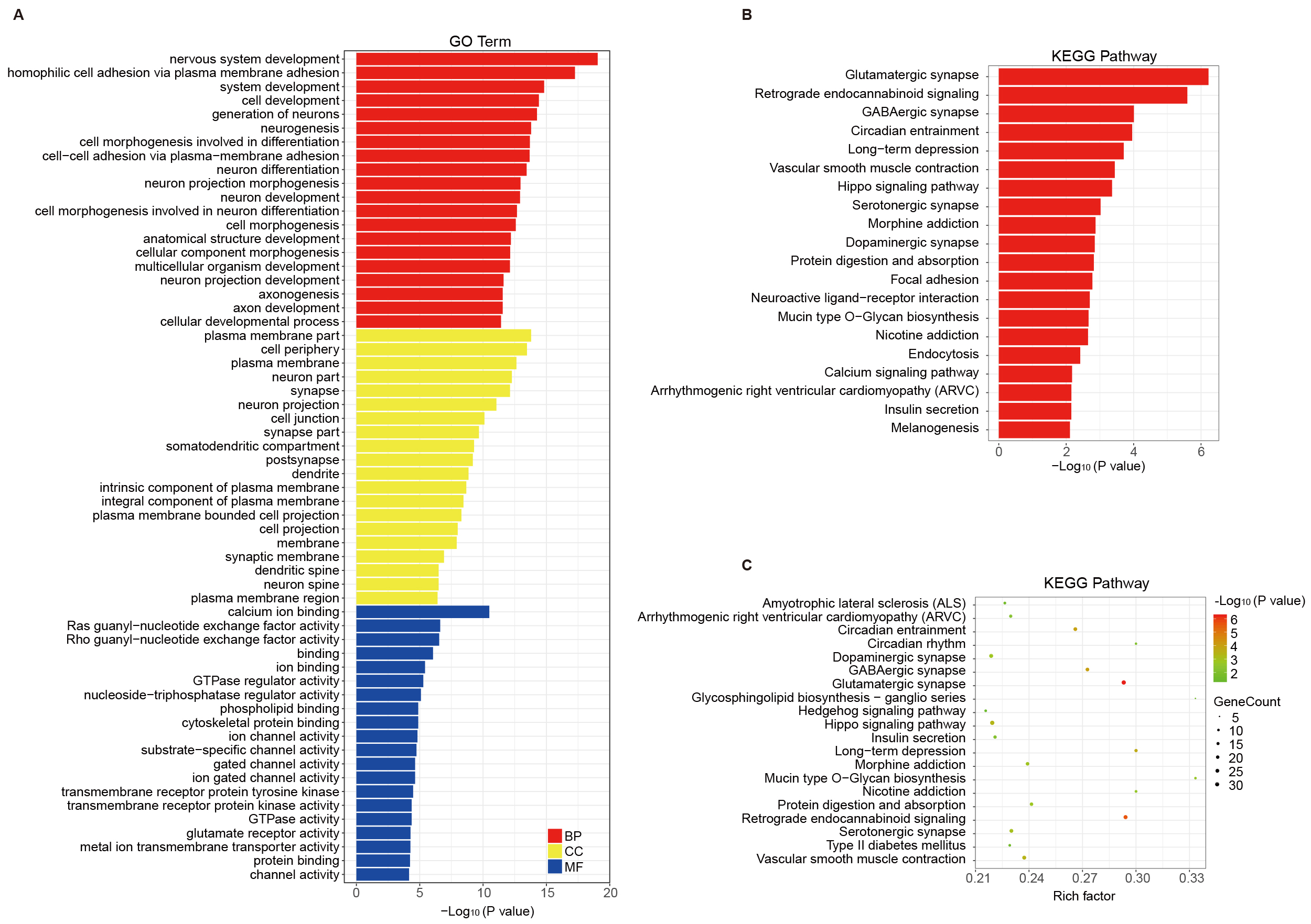 Functional annotation analysis (Gene Ontology, GO) was performed for genes that were associated with the identified MVPs (Fig. 2A). GO annotations, including biological process, cellular component, and molecular function categories, were analyzed according to the MVP-annotated genes. The biological process category emphasized the processes of nervous system development, generations of neurons, and neurogenesis. The cellular component category highlighted neuron projection, dendrite, and synaptic membrane. The molecular function category was differentially enriched in calcium ion binding, Ras/Rho guanyl-nucleotide exchange factor activity, phospholipid binding, GTPase/nucleoside-triphosphatase regulator activity, cytoskeletal protein binding and other related functions (Supplementary Table 3). KEGG pathway enrichment of the targeted genes showed that glutamatergic synapse, neuroactive ligand-receptor interaction, retrograde endocannabinoid signaling, γ-Aminobutyric acid (GABA)ergic synapse, circadian entrainment and Hippo signaling pathway were highly connected to AD (Fig. 2B, Supplementary Table 3). The KEGG pathway enrichment bubble plot of MVPs is shown in Fig. 2C.