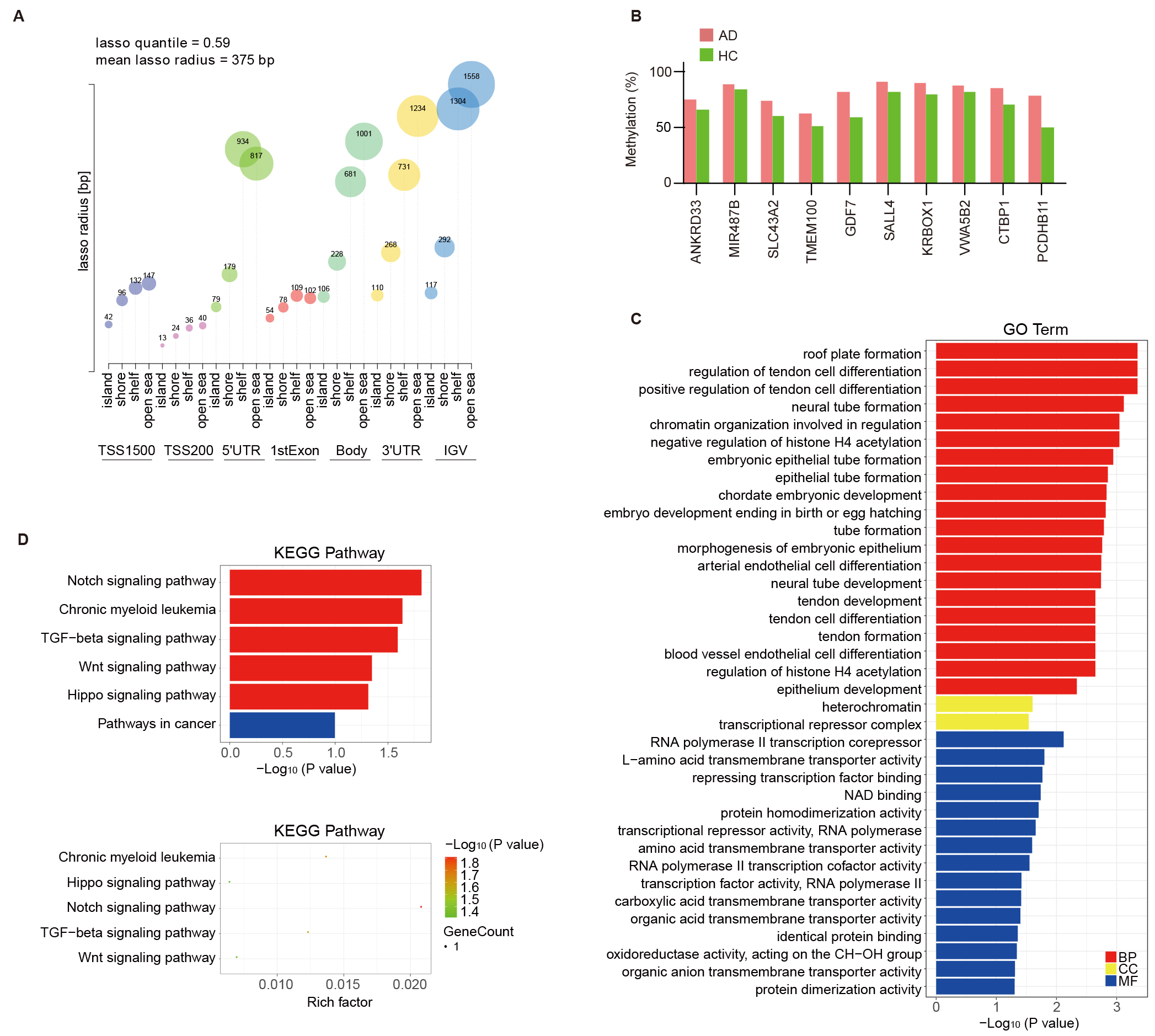 GO annotation and KEGG pathway enrichment analyses were carried out based on the DMRs annotated genes. The biological process category emphasized the enriched GO terms related to nervous system development, including neural tube formation and development. The cellular component category highlighted heterochromatin and transcriptional repressor complex. The molecular function category was differentially enriched in RNA polymerase II transcription corepressor, repressing transcription factor binding, protein homodimerization activity, and NAD binding (Fig. 3C). KEGG pathway enrichment highlighted the roles for the Notch, TGF-β, Wnt, and Hippo signaling pathways in AD (Fig. 3D). This suggests that DMRs annotated genes in AD may influence the disease’s progression by modulating immune processes.
