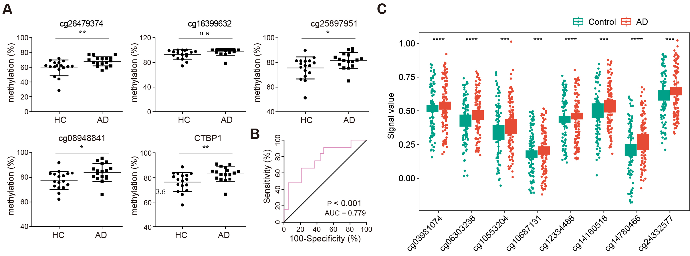 Our work depicted the DNA methylation profiles in peripheral blood from AD patients by Illumina Infinium MethylationEPIC BeadChip, covering over 850,000 CpG methylation sites, and discovered MVPs and pathology-linked DMRs. Notably, elevated methylation levels in CTBP1 promoter were significantly correlated with the onset of AD in both test and validation groups. This discovery likely promotes the development of AD diagnostic biomarkers from the methylation alterations. The innovative methodology had already been submitted to and approved by China National Intellectual Property Administration (Application No. CN202311322013.6), potentiating the clinical application of the biomarker.