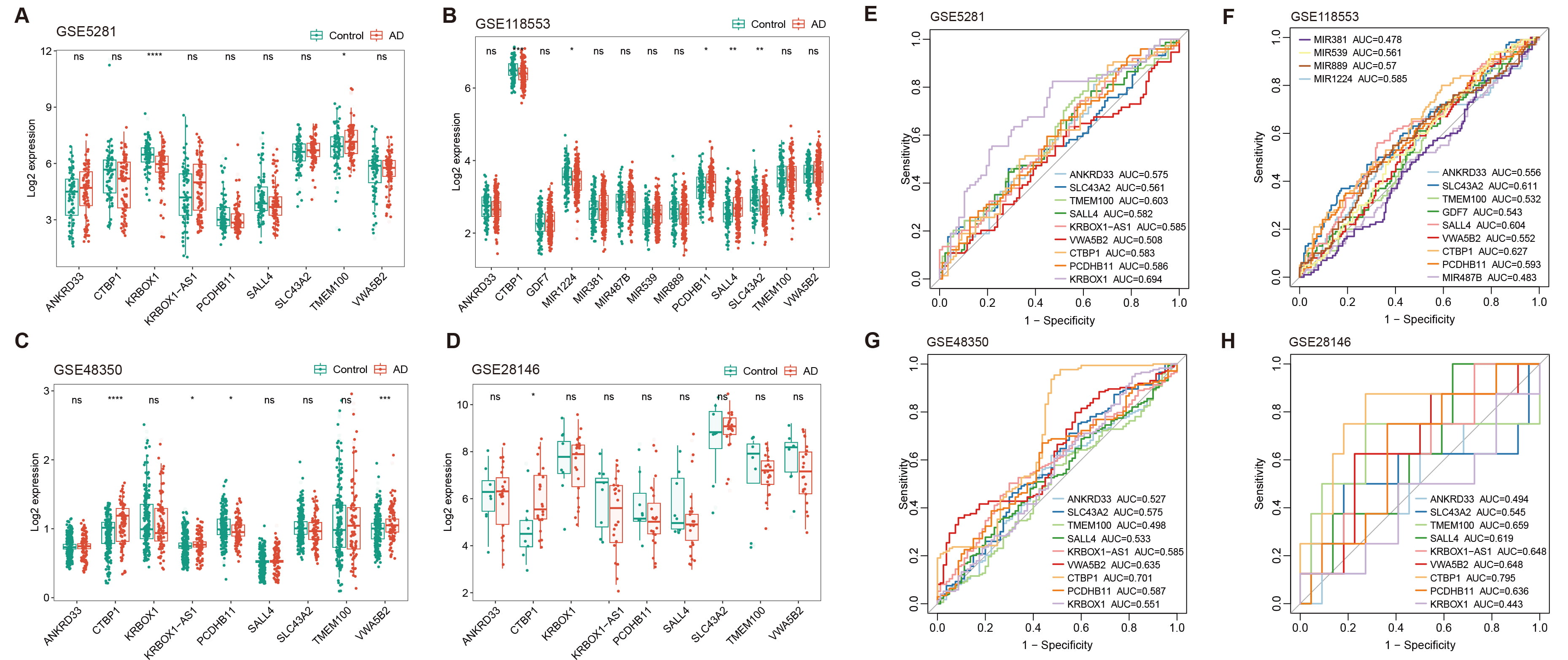 Regions of aberrant methylation were initially identified in the DNA in peripheral blood from AD patients and these regions were linked to key genes. To investigate whether the expression of these genes in the brain undergoes changes that might influence the progression of AD, four datasets from the GEO public database were analyzed: GSE5281, GSE118553, GSE48350, and GSE28146. Results indicated that CTBP1 expression changes were the most significant and consistent across these datasets (Fig. 6A–D), However, the expression of CTBP1 varied significantly across these datasets, showing both downregulation (Fig. 6B) and upregulation (Fig. 6C,D) in AD when compared to HCs. This variability in CTBP1 expression was attributable to its distinct expression specificity in different brain regions, such as decreased CTBP1 in the cerebellum (GSE118553) and increased CTBP1 in the hippocampus (GSE48350, GSE28146), implying a regional involvement in AD development