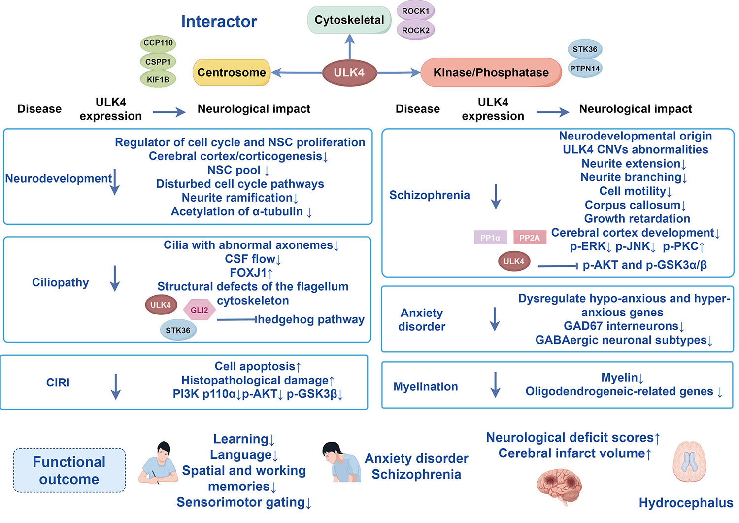 Deletion of ULK4 results in a thinner cortex, and a negative influence on neurite branching and neuronal motility. Brain-specific deletion of ULK4 leads to the malfunction of motile cilia, thereby resulting in congenital hydrocephalus. Severe language delay and learning difficulty are observed in the majority of ULK4-mutant children. ULK4, on the other hand, is closely associated with neuropsychiatric disorders. Susceptibility to schizophrenia is increased by ULK4 deletion. Deleting ULK4 causes changes in GABAergic neurons, which may be a major factor in reinforcing anxiety. Conversely, overexpression of ULK4 inhibits apoptosis, subsequently alleviating CIRI. The role of ULK4 in neurodevelopment and neuropsychiatric disorders is well established in overall association (Graphic abstract). Nevertheless, partial behavioral phenotypes and specific mechanisms are still controversial, such as anxiety-like behavior and radial migration of pyramidal neurons. This review summarizes the most recent research updates in the neuropsychiatric disorders and neurodevelopment concerning ULK4, and covers a larger coverage, such as CIRI, and interaction partners of ULK4, which further demonstrates the positive effects of ULK4 on neuropsychiatric disorders. In addition to this, this review highlights current inconsistencies in ULK4 research while explaining possible reasons for these discrepancies.