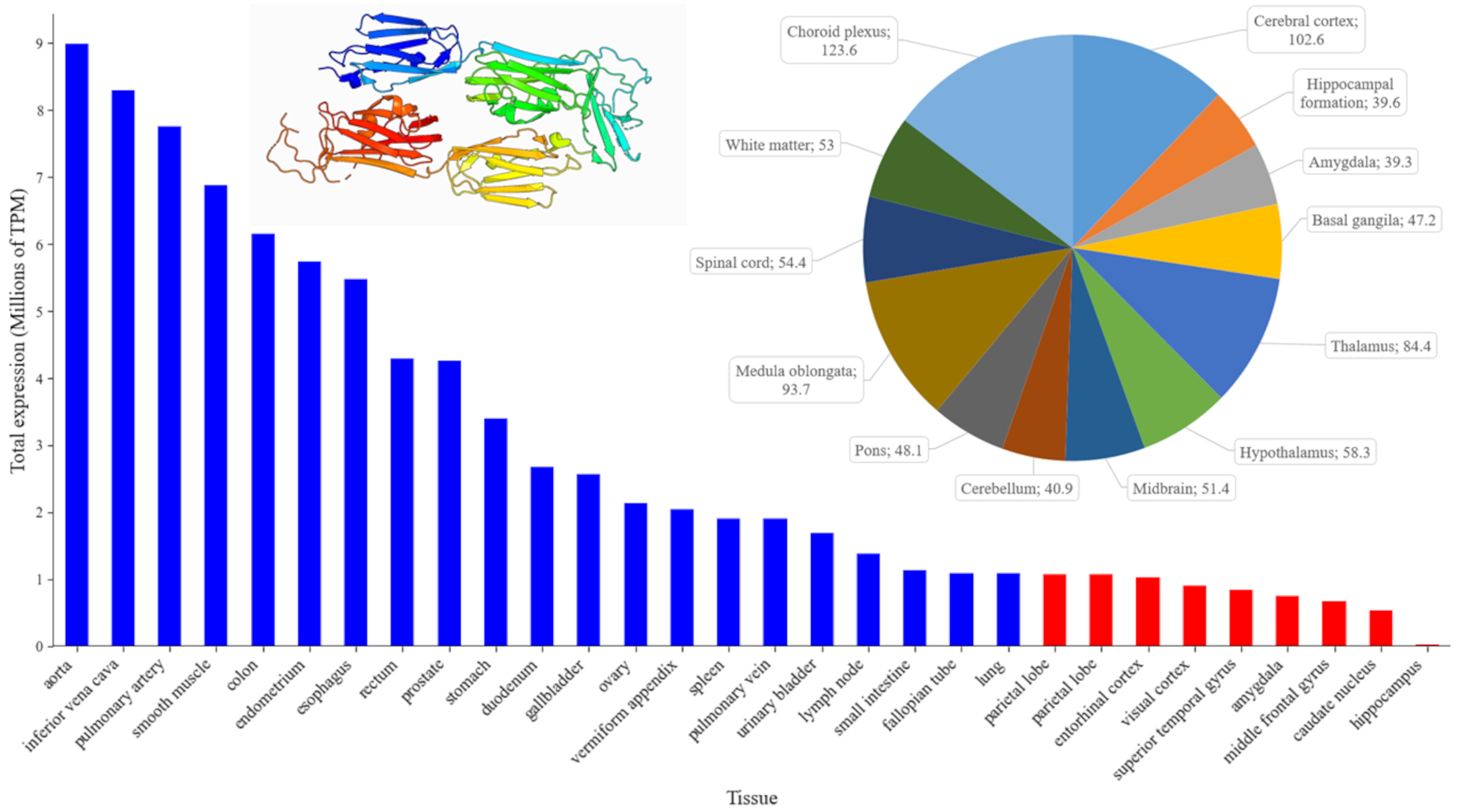 Fig. 1. Patterns of FLNA expression across human organs (blue bars) and major brain regions (red bars). The bar chart ranks the top human tissues by mean gene expression, measured in Transcripts Per Million (TPM) using the ENSEMBL database (https://www.ensembl.org/Homo_sapiens/Gene/Summary?db=core;g=ENSG00000196924;r=X:154348524-154374634, accessed September 2024). The pie chart (top right) displays the normalized gene expression levels (nTPM) in different regions of the human brain, using data from the Human Protein Atlas (https://www.proteinatlas.org/ENSG00000196924-FLNA/brain, accessed September 2024). Each pie chart segment is labeled with specific brain regions and their corresponding expression values, providing a detailed view of FLNA distribution within the central nervous system (CNS) (https://www.proteinatlas.org/ENSG00000196924-FLNA/brain, accessed September 2024). Inset: Crystal structure of 19–21 Ig-like domains of human filamin A protein (FLNA), according to the Protein Database (PDB, https://www.ncbi.nlm.nih.gov/protein/, PDB ID: 2J3S, plotted in pyMOL (https://www.pymol.org, assessed September 2024). For interpretation of the references to color in this figure legend, the reader is referred to the online version of this article.