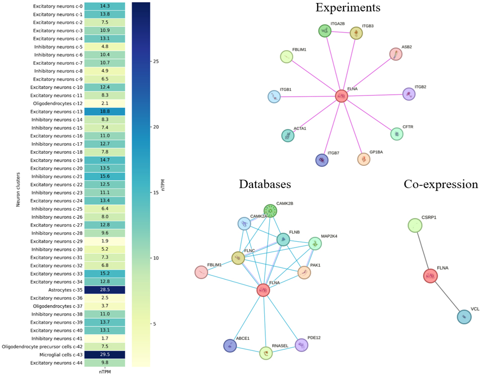 Fig. 2. Heatmap of FLNA expression across various neuronal and glial cell clusters in the human brain, measured in normalized Transcripts Per Million (nTPM), according to the Human Protein Atlas (https://www.proteinatlas.org/ENSG00000196924-FLNA/brain, accessed September 2024). The heatmap shows FLNA expression in excitatory and inhibitory neurons, astrocytes, microglia, and oligodendrocytes. The right three panels display the protein-protein interaction (PPI) network for FLNA (central red circle), with interactions classified by data type, according to the Search Tool for the Retrieval of Interacting Genes/Proteins (STRING database, https://string-db.org/, accessed September 2024; pink lines denote experimentally validated interactions, blue lines denote biological databases, and black lines showgene co-regulation or similarity). ITGA2B, integrin alpha-IIb; PAK1, p21 activated kinase 1; CSRP1, cysteine and glycine rich protein 1; ITGB, integrin subunit beta; ASB2, ankyrin repeat and SOCS box containing 2; CFTR, cystic fibrosis transmembrane conductance regulator; GP1BA, glycoprotein Ib platelet subunit alpha; ACTA1, actin alpha 1 skeletal muscle; FBLIM1, filamin binding LIM protein 1; CAMK2B, calcium/calmodulin dependent protein kinase II beta; FLNB, filamin B; FLNC, filamin C; ABCE1, ATP binding cassette subfamily E member 1; RNASEL, ribonuclease; PDE12, phosphodiesterase 12; MAP2K4, mitogen-activated protein kinase kinase 4; VCL, vinculin. For interpretation of the references to color in this figure legend, the reader is referred to the online version of this article.