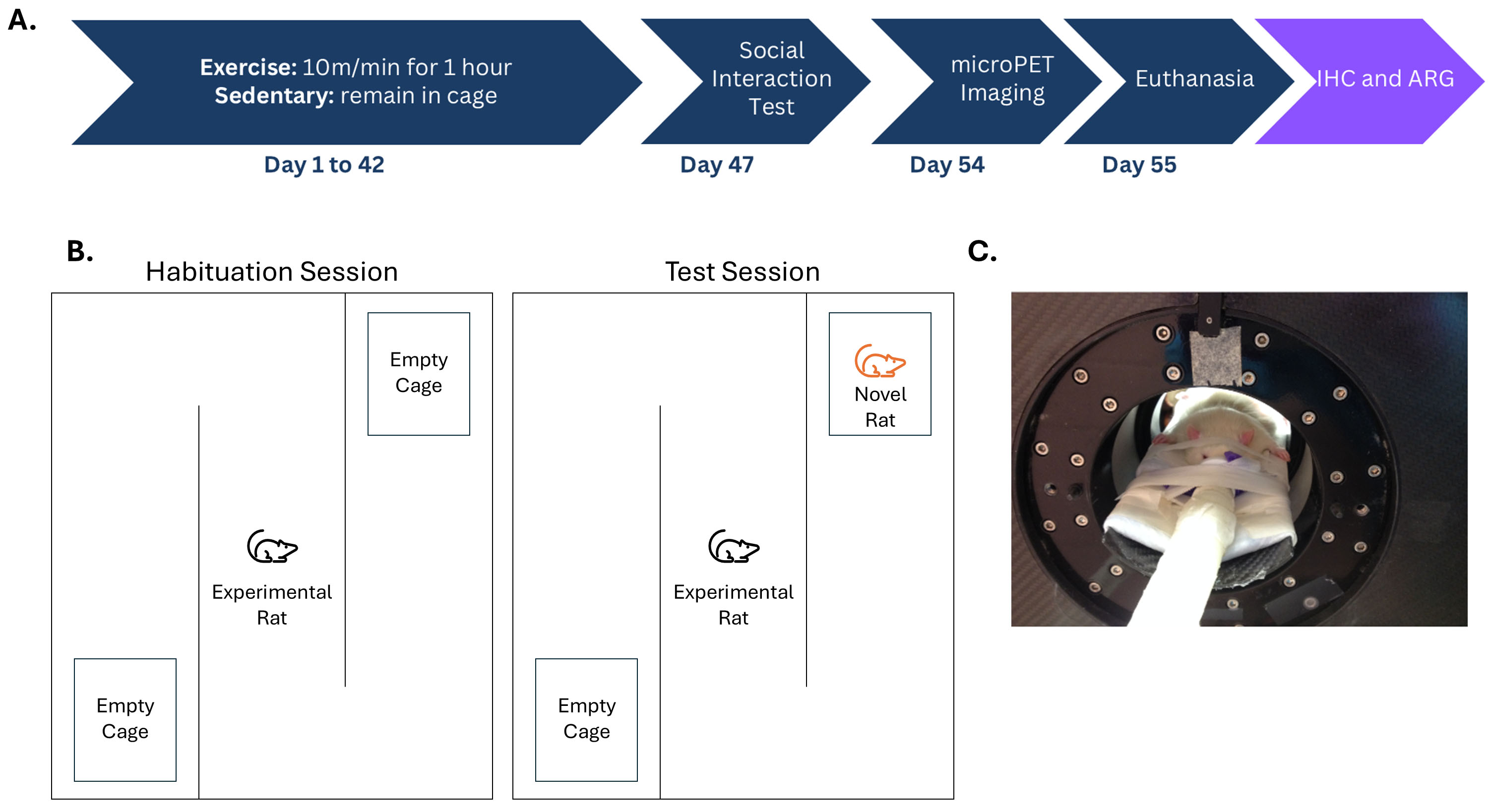 Male sedentary and chronic exercise rats were examined for dopamine signaling and social behavior. Tyrosine hydroxylase (TH) immunohistochemistry (IHC), and D1 and D2 receptor (D1R and D2R) autoradiography was used to assess dopamine signaling; [18F]-Fluorodeoxyglucose positron emission tomography (FDG PET) was used to measure brain functional connectivity; Crawley’s three-chamber sociability test was used to measure social behavior; and Pearson correlation was used to analyze correlations between social interaction and TH, D1R, and D2R binding.