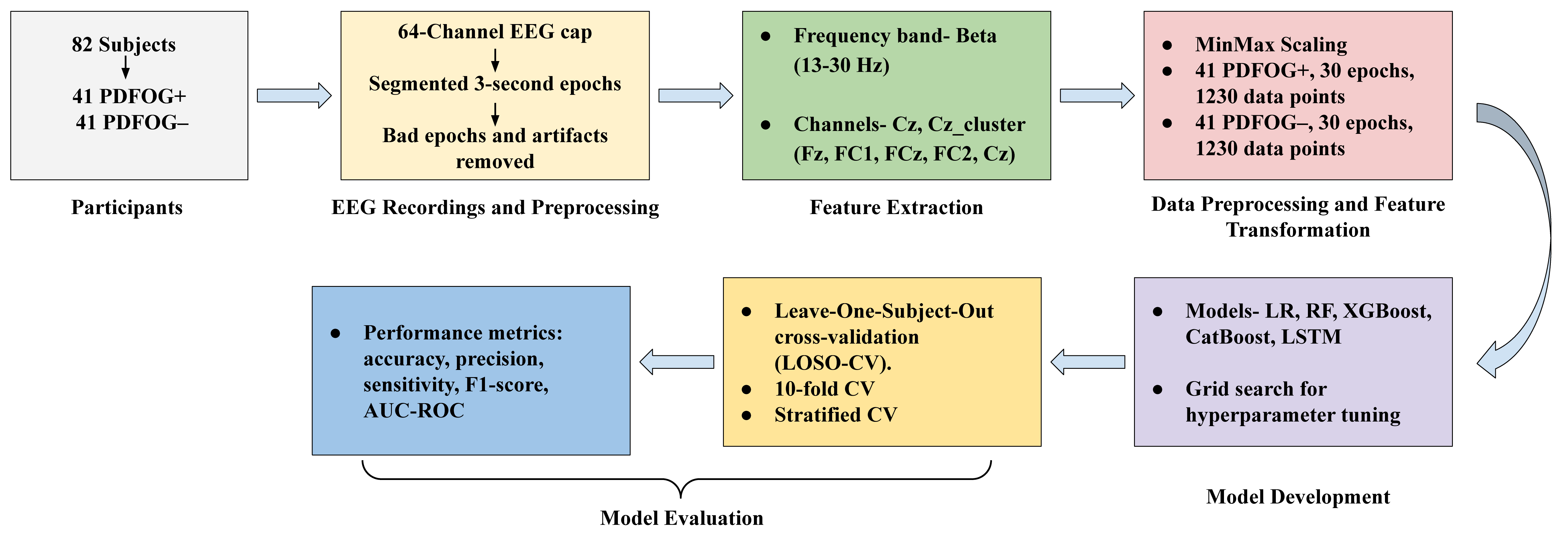 Flow diagram of the methodology for classifying PDFOG+ and PDFOG– using EEG data, covering participant enrollment, EEG preprocessing, feature extraction, data transformation, model development, and evaluation. EEG, electroencephalographic; LR, logistic regression; RF, random forest; XGBoost, extreme gradient boosting; CatBoost, categorical boosting; LSTM, long short term memory; AUC-ROC, area under the receiver-operating characteristic; LOSO, leave-one-subject-out; CV, cross-validation.