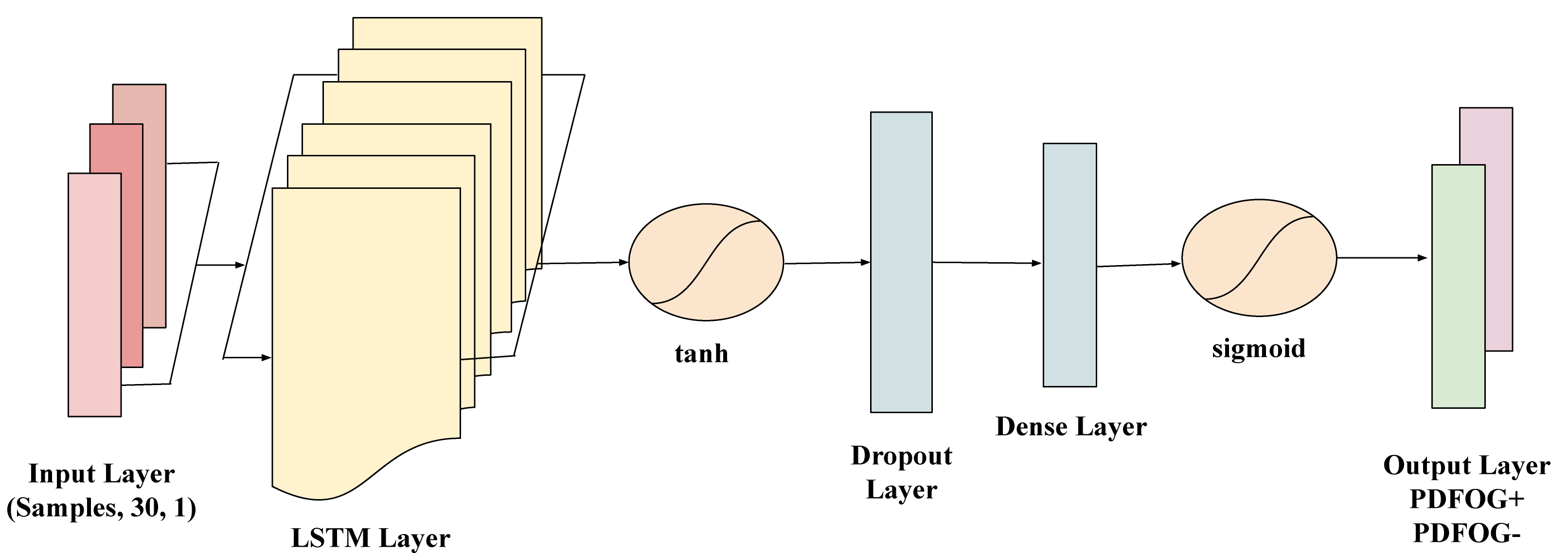 Architecture of the long short-term memory (LSTM) network used for classifying PDFOG+ and PDFOG– based on EEG data. The model takes input sequences shaped as (samples, 30, 1) representing 30 time steps with 1 feature each. It includes an LSTM layer with a tanh activation function to capture temporal dependencies, followed by a Dropout layer to prevent overfitting. A Dense layer further processes the extracted features, and the output layer with a sigmoid activation function performs binary classification into PDFOG+ and PDFOG– groups.