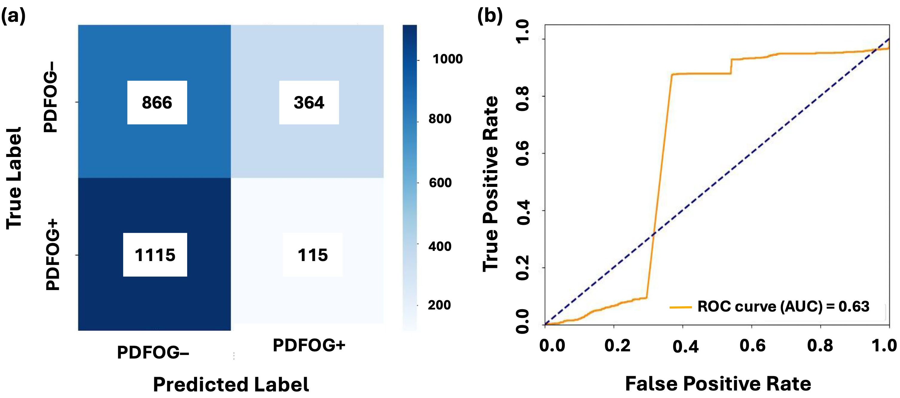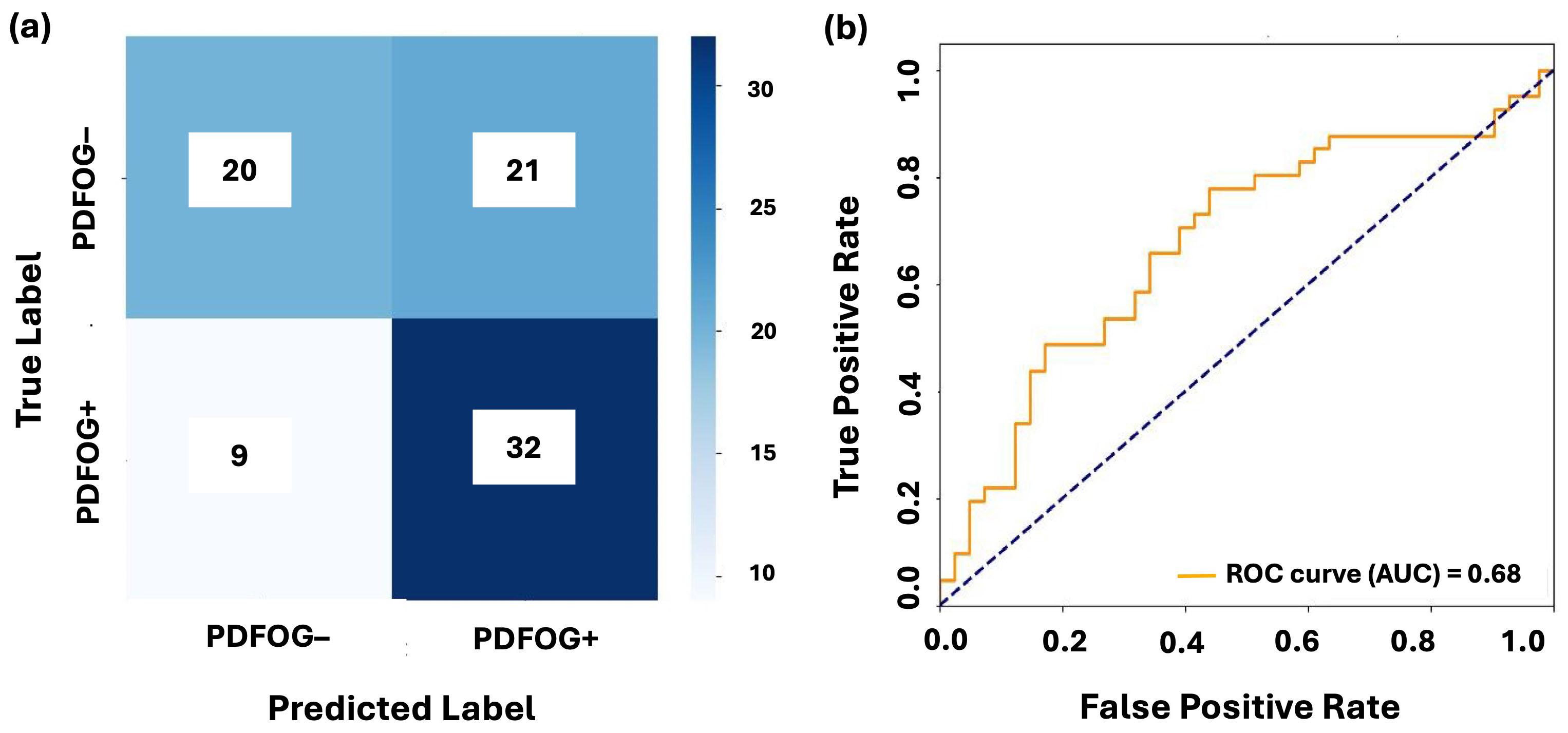 Classification performance of LSTM on midfrontal Cz-cluster beta band. (a,b) show the confusion matrix and AUC-ROC curve for LSTM with leave-one-subject-out cross-validation on the midfrontal Cz-cluster beta band. The confusion matrices illustrate the distribution of true positives, false positives, true negatives, and false negatives for PDFOG+ and PDFOG– groups. The AUC-ROC curves demonstrate ability of model to discriminate between PDFOG+ and PDFOG– across varying classification thresholds, with the AUC indicating the models’ discriminative performance (0.68 for LSTM).