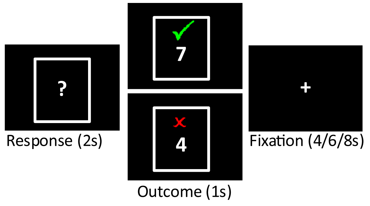 Participants performed the card guessing task [14] following structural scans and a resting state functional scan, approximately 20 minutes after entering the scanner. Stimuli were presented and response times were collected using E-Prime version 2.0 (Psychological Software Tools, Pittsburgh, PA, USA). In each trial of the task, participants saw a card (white rectangle with a “?” in the center) and pressed a button to guess whether the value of the card was lower (second digit of the right hand) or higher (third digit of the right hand) than the number 5, with knowledge that the number would be between 1 and 10 but never 5, and that correct guesses would add