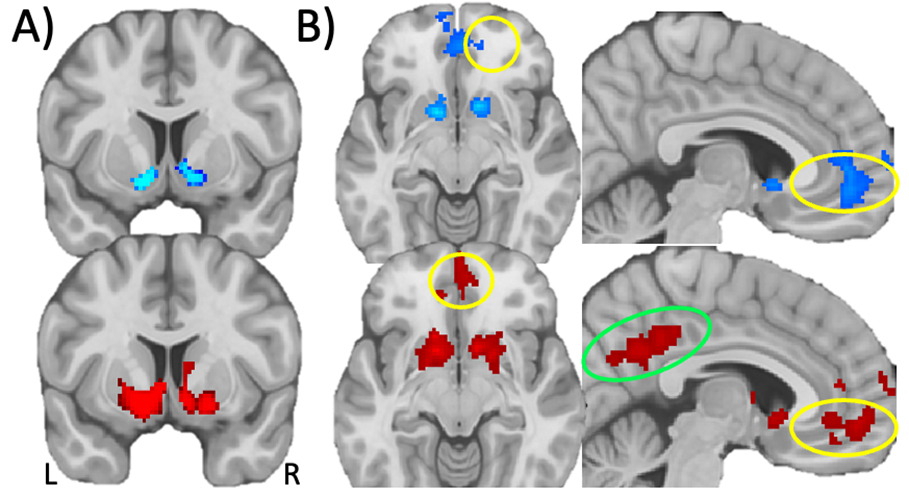 Fig. 2. Monetary gain versus loss responses in whole brain voxelwise GLM analysis. (A) Statistical map of monetary gain versus loss in POUD (blue) and control (red) participants in the ventral striatum (colors indicate voxelwise p