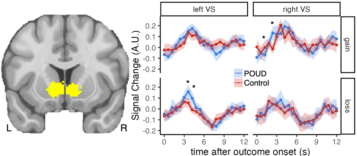 Ventral striatum signal change following gain and loss outcomes differed between the POUD and control groups. Specifically, time series analysis suggested that left ventral striatum responses following monetary losses remained elevated for a longer duration in POUD compared with control group participants.