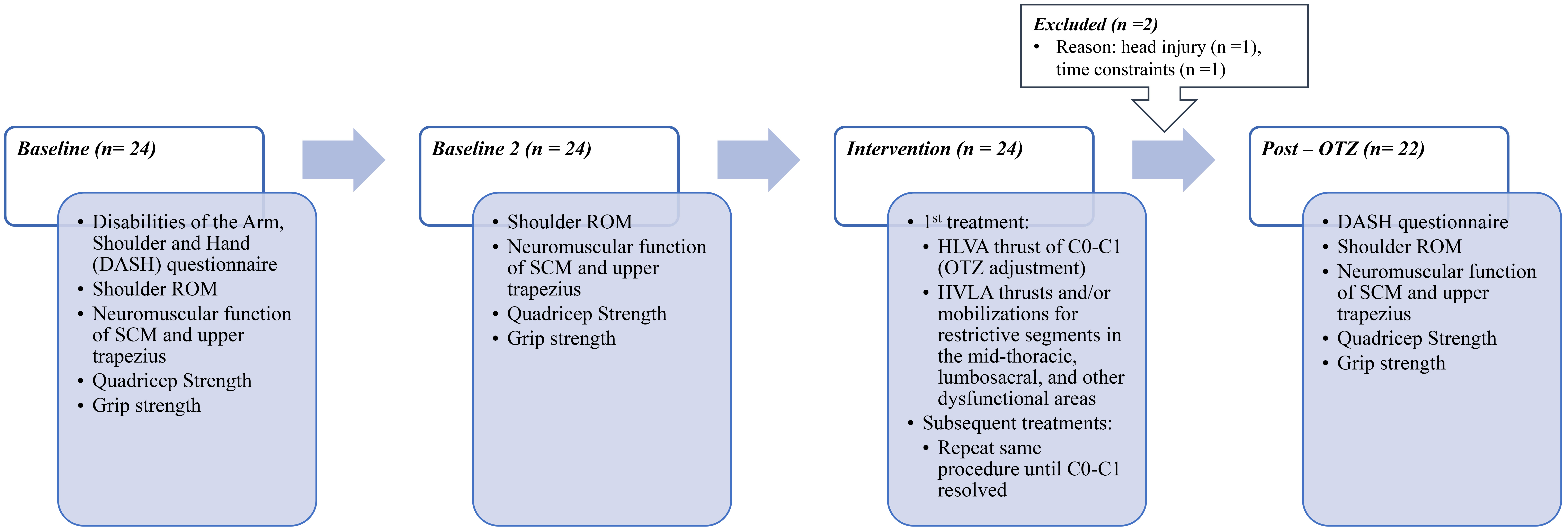 Baseline measures were completed within one week of confirming eligibility. After the initial baseline collection, participants were scheduled for a second baseline measurement session, conducted 2 to 5 days later and prior to the first intervention. During this control period, participants were instructed to refrain from receiving any type of intervention. This was intended to capture the effects of this dysfunction in the absence of treatment, control for potential familiarity or learning effects, and measurement stability. Immediately after the second baseline collection, participants attended their first treatment session with the chiropractor. Within a week of the final treatment session, participants attended the post-OTZ data collection session, which was arranged via email communication initiated by the researcher. See Fig. 1 for experimental protocol.