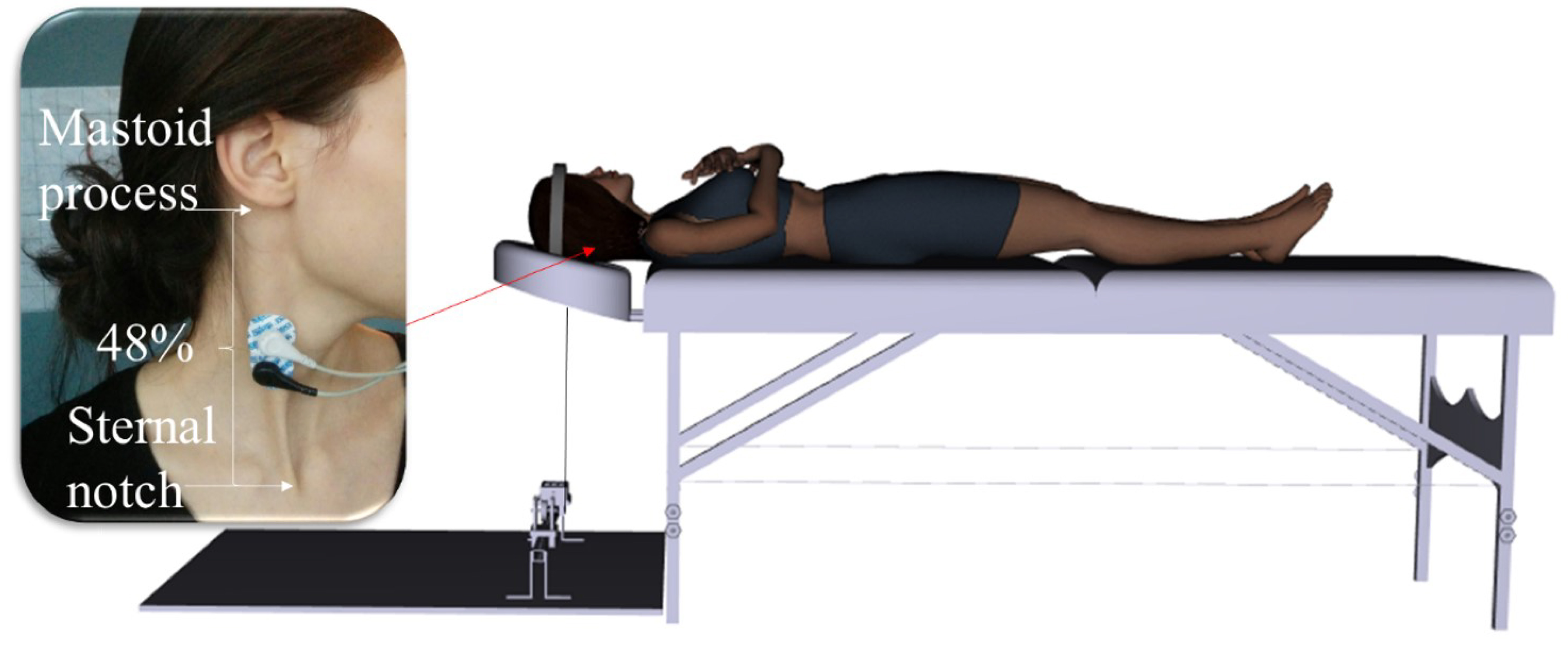 Fig. 2. Experimental set-up for SCM muscle MVC. MVC, maximum voluntary contraction. (Created using Santos Pro software (V.1.5 2017, SantosHuman, Inc., Coralville, Iowa, USA)).