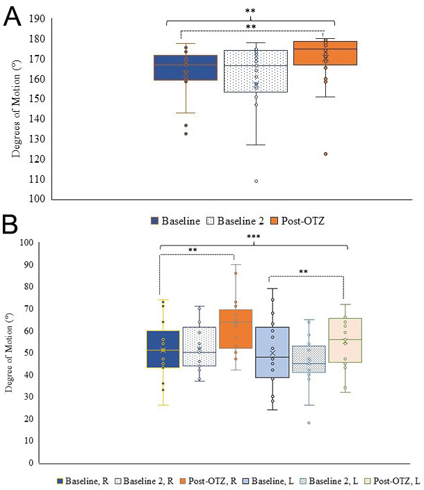 Fig. 4. Shoulder range of motion. (A) Box and whisker plot for shoulder abduction ROM at the three time points. (B) Box and whisker plot for shoulder extension ROM per side and time point. Blue represents baseline, dotted represents baseline 2, and orange represents post-OTZ. The whiskers reflect minimum and maximum values. The boxes reflect the quartiles, and x symbol represents median. Dashed bars and asterisk(s) indicate a significant contrast. **p