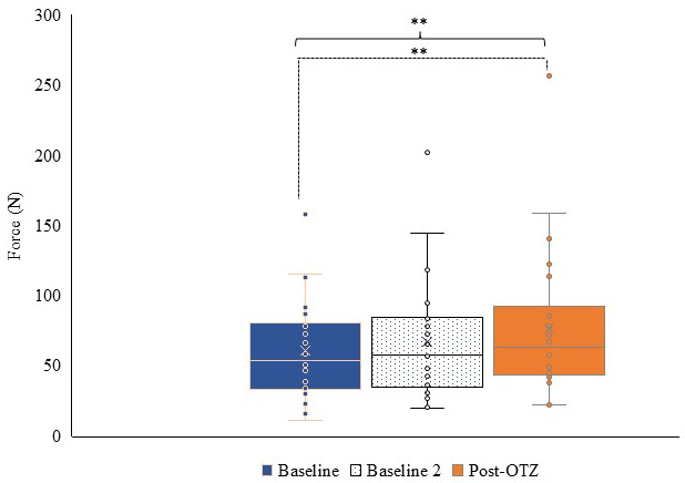 Fig. 5. Box and whisker plot for force output of the SCM at each time point. Blue represents baseline, dotted represents baseline 2, and orange represents post-OTZ. The whiskers reflect minimum and maximum values. The boxes reflect the quartiles, and x symbol represents median. Dashed bars and asterisk(s) indicate a significant contrast. ** p