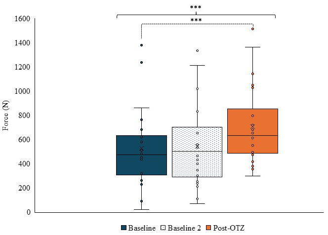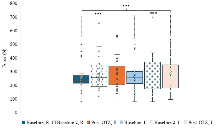 Fig. 7. Box and whisker plot for force output of the quadriceps per side and time. Blue represents baseline, dotted represents baseline 2, and orange represents post-OTZ. The whiskers reflect minimum and maximum values. The boxes reflect the quartiles, and x symbol represents median. Dashed bars and asterisk(s) indicate a significant contrast. *** p