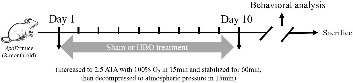 ApoE-/- mice received HBO treatment for 10 consecutive days, and then behavioral assessment tests were performed. Serum and brain tissue were collected to measure oxidative stress levels and inflammatory factors.