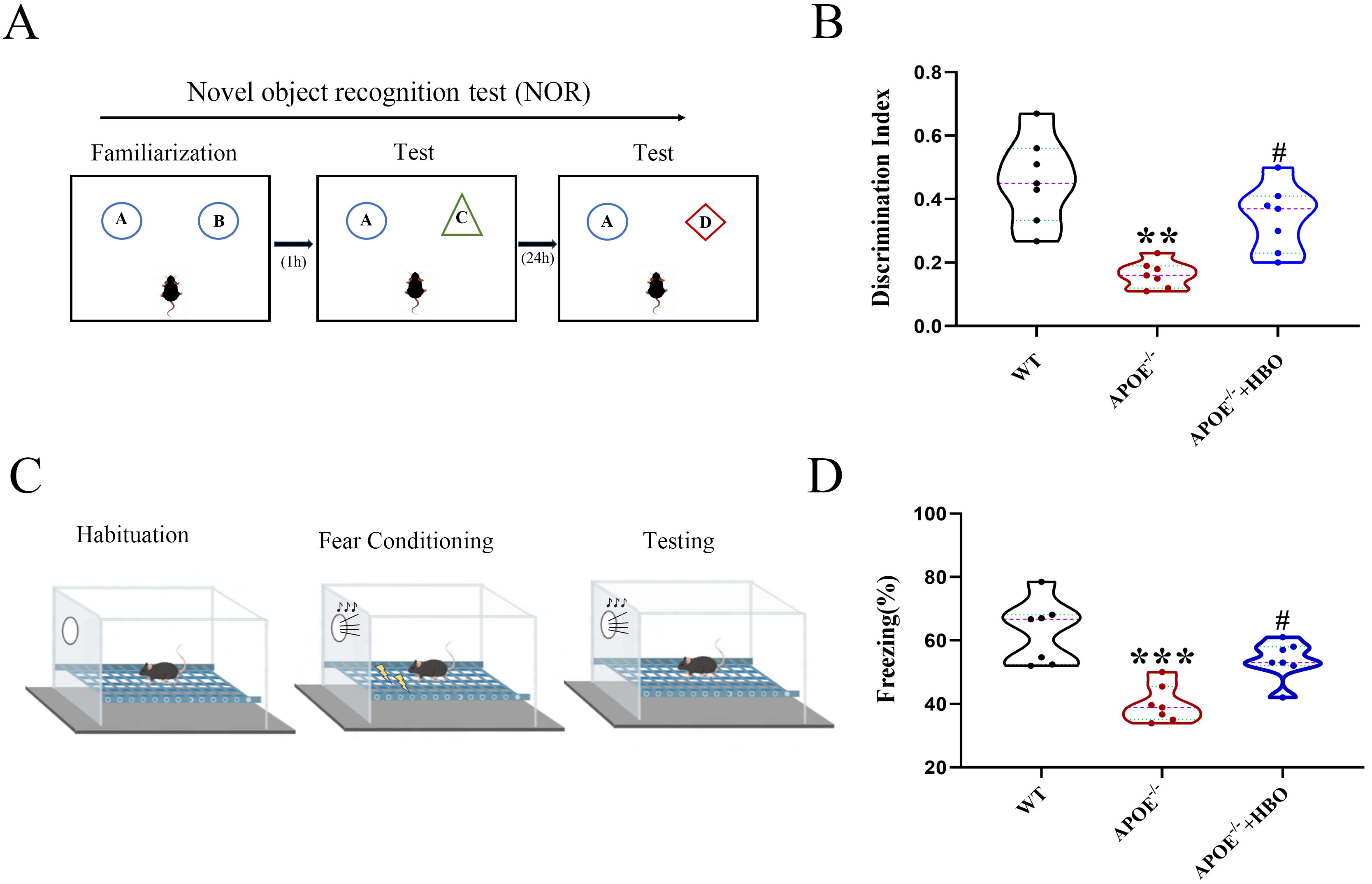 Fig. 1. Schematic illustration of the overall experimental procedure. A series of behavioral tests were performed after hyperbaric oxygen (HBO) treatment to assess cognitive function, including novel object recognition experiment and fear conditioning test. ATA, absolute atmospheric pressure; APOE-/-, apolipoprotein E-deficient.