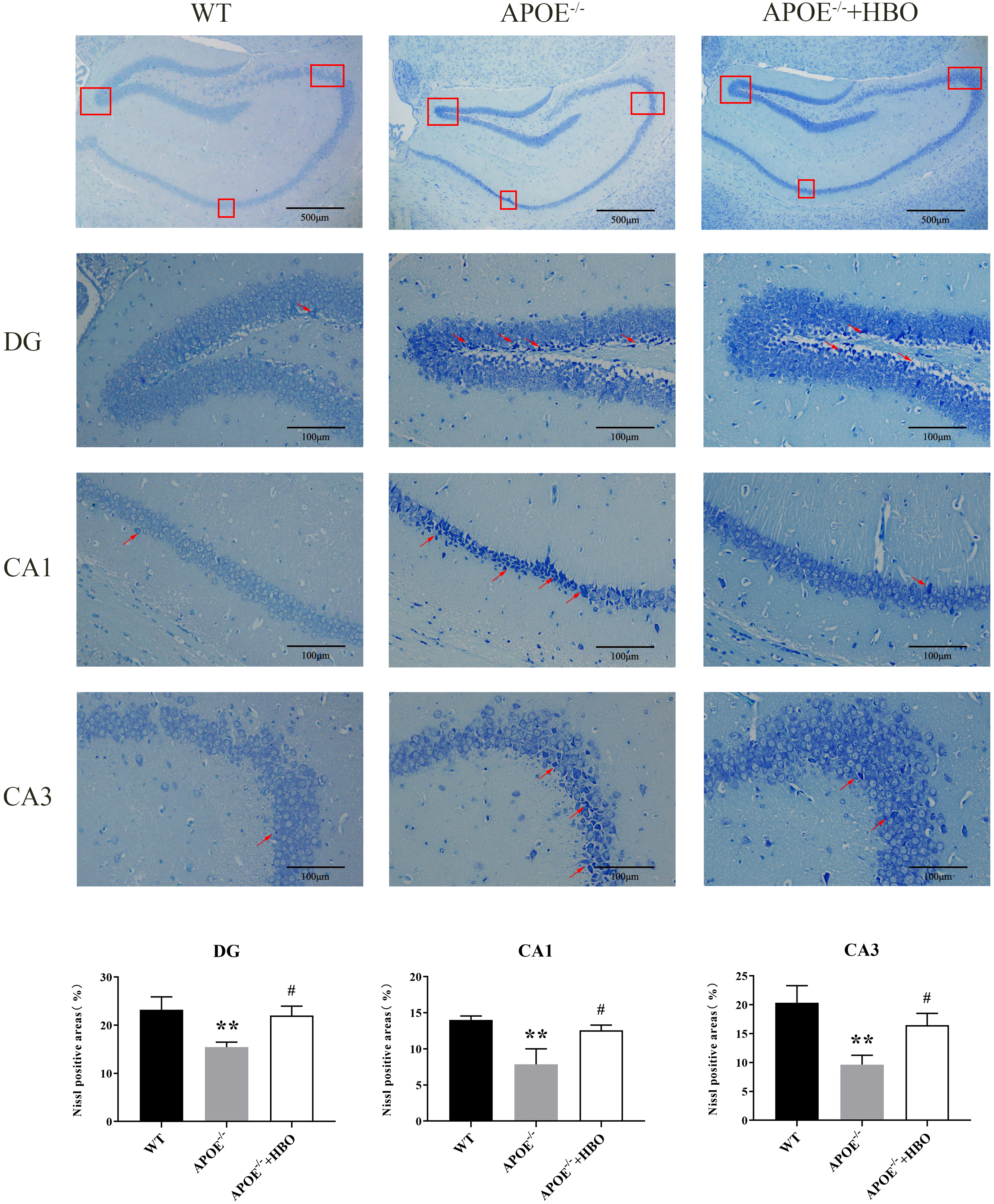 Fig. 3. Effect of HBO treatment on hippocampal damage. Hippocampal morphology with Nissl staining. The scale bar = 500 µm (the top panels), 100 µm (the middle panels). n = 4 in each group. The top of the image is the representative immunoblots and the bottom of the image is the quantification for analysis. The red boxes indicates different regions of the hippocampus that have been selected for analysis. In neuroanatomy, the hippocampus is often divided into subregions (e.g., CA1, CA3, or dentate gyrus), and the box highlights these areas. The red arrow shows the Nissl body. The changes in Nissl bodies can signal apoptosis or neurodegeneration. The arrow directs attention to these features. ** p