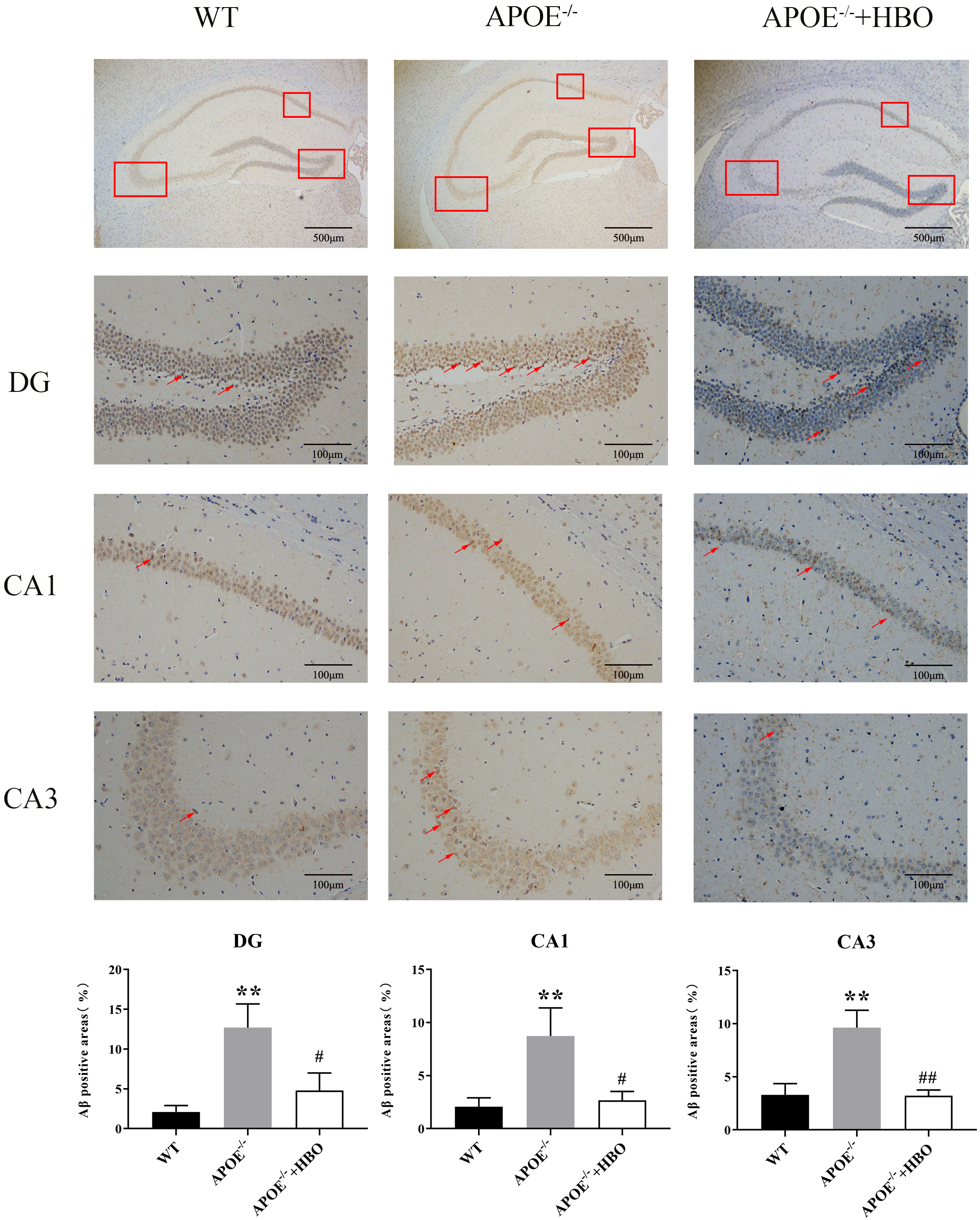 Compared with ApoE-/- group, cognitive declines was significantly reversed in mice of the ApoE-/-+HBO mice. The blood lipid profiles of ApoE-/- mice were also improved after HBO treatment, accompanied by a reduction in body weight. Moreover, HBO treatment was found to ameliorates neuronal injury and amyloid-β deposition in the hippocampus of ApoE-/- mice. Further studies have revealed that the benefits of HBO treatment occurred through the reduction of inflammatory factors and attenuation of oxidative stress.