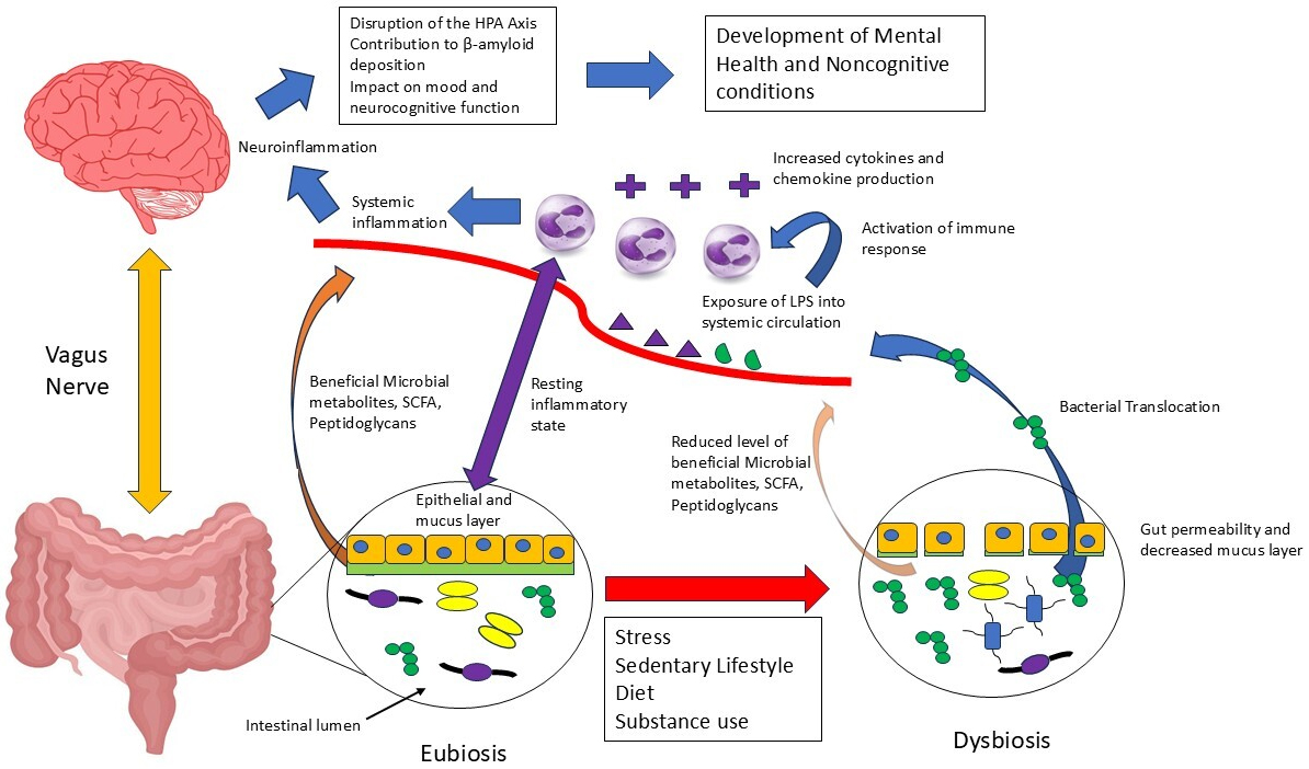 There is a growing body of evidence that the interaction between various microbial organisms and the human host can affect various physical and even mental health conditions. Bidirectional communication occurs between the brain and the gut microbiome, referred to as the brain-gut-microbiome axis. During aging, changes occur to the gut microbiome due to various events and factors such as the mode of delivery at birth, exposure to medications (e.g., antibiotics), environmental exposures, diet, and host genetics. Connections to the brain-gut-microbiome axis through different systems also change during aging, leading to the development of chronic diseases. Disruption of the gut microbiome, known as dysbiosis, can lead to a reduction in beneficial bacteria and a corresponding increase in more harmful or even pathogenic bacteria. This imbalance may predispose or contribute to the development of various health conditions and illnesses. Targeted treatment of the gut microbiome and the brain-gut-microbiome axis may assist in the overall management of these various ailments. The purpose of this review is to describe the changes that occur in the gut microbiome throughout life, and to highlight the risk factors for microbial dysbiosis. We discuss the different health conditions experienced at various stages of life, and how dysbiosis may contribute to the clinical presentation of these diseases. Modulation of the gut microbiome and the brain-gut-microbiome axis may therefore be beneficial in the management of various ailments. This review also explores how various therapeutics may be used to target the gut microbiome. Gut biotics and microbial metabolites such as short chain fatty acids may serve as additional forms of treatment. Overall, the targeting of gut health may be an important strategy in the treatment of different medical conditions, with nutritional modulation of the brain-gut-microbiome axis also representing a novel strategy.