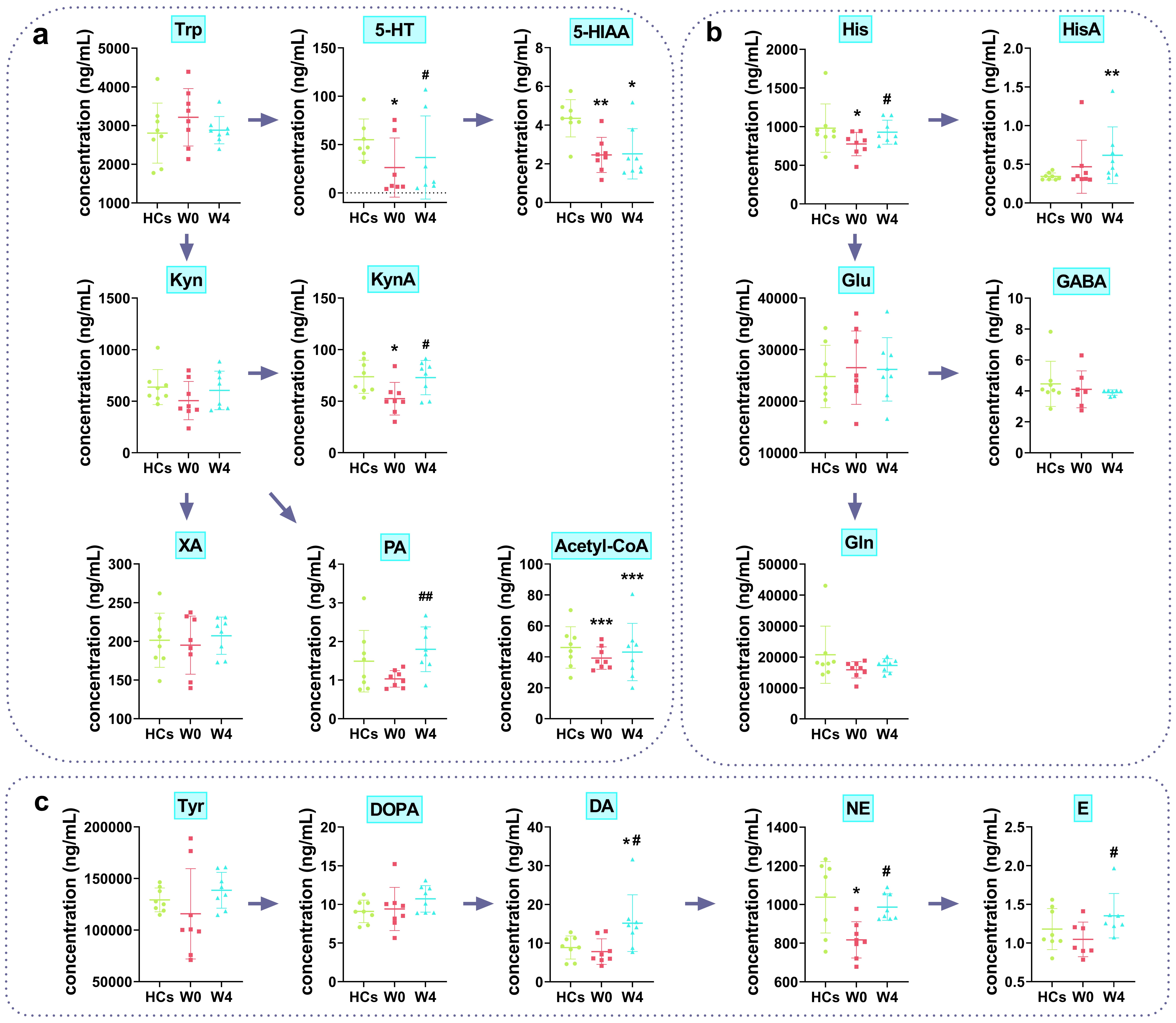 Fig. 2. Serum levels of neurotransmitters in healthy controls and patients with depression before and after acupuncture treatment. (a) Eleven kinds of neurotransmitters involved in tryptophan metabolism. (b) Five kinds of neurotransmitters involved in histidine and glutamate metabolism. (c) Seven kinds of neurotransmitters involved in tyrosine metabolism. The neurotransmitters within blue boxes were detected. #p