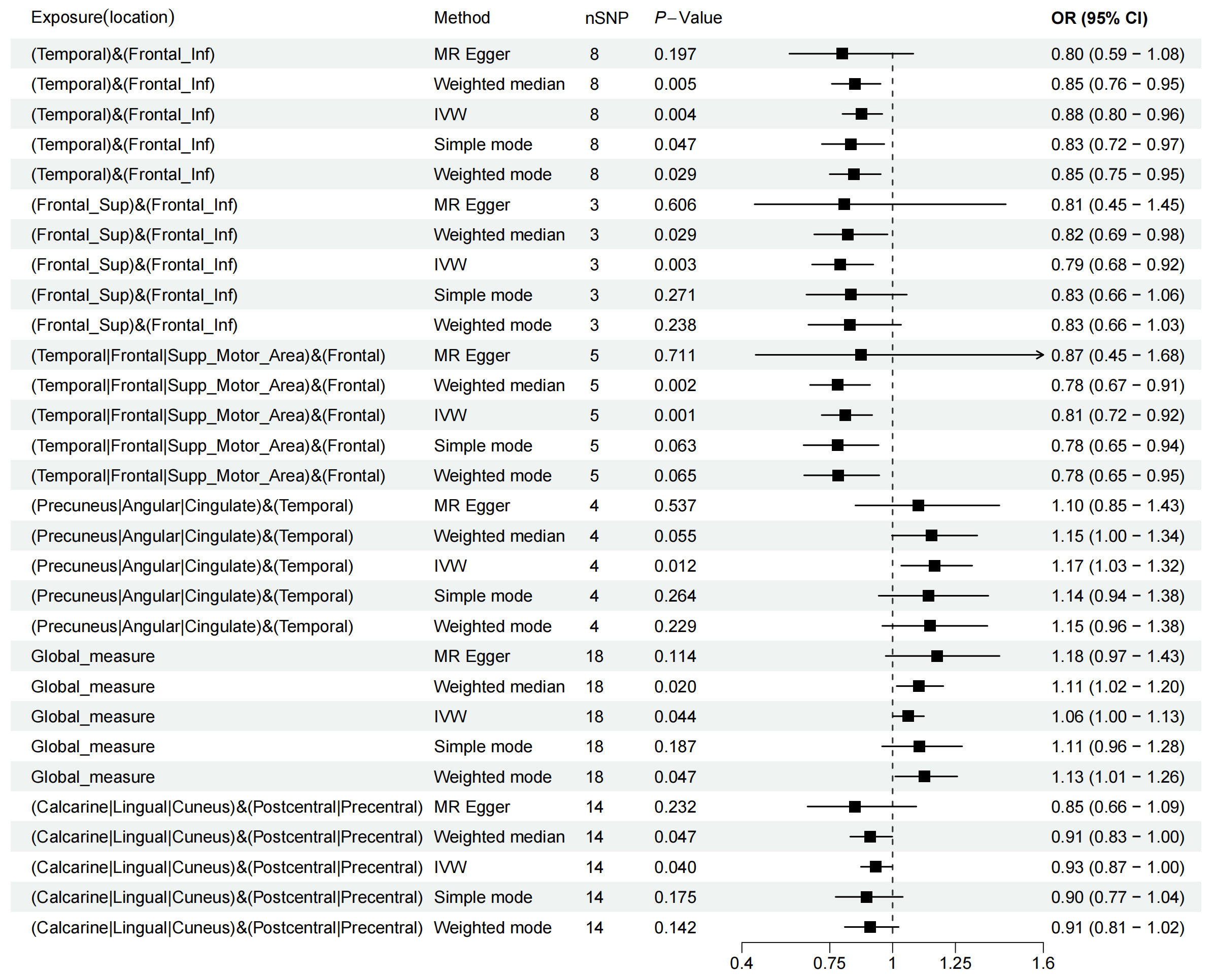An MR analysis found that increased FC between the temporal lobe and inferior frontal gyrus (IFG) reduced the risk of depression (Inverse-Variance Weighted Odds Ratio (IVW OR) = 0.88, 95% Confidence Interval (CI): 0.80–0.96, p = 0.004). Additionally, it was found that enhanced neural connection activity in SFG and IFG was associated with a lower risk of depression (IVW OR = 0.79, 95% CI: 0.68–0.92, p = 0.003). Further analysis revealed that higher FC of the temporal lobe, frontal lobe or supplementary motor area and frontal lobe was inversely related to depression risk (IVW OR = 0.81, 95% CI: 0.72–0.92, p = 0.001). Conversely, it was discovered that increased FC between precuneus, angular gyrus or cingulate and temporal lobe elevated the risk of depression (IVW OR = 1.17, 95% CI: 1.03–1.32, p = 0.012). It is also noted that higher connectivity in the global measure of the default mode network (DMN) was associated with a heightened risk of depression (IVW OR = 1.06, 95% CI: 1.00–1.13, p = 0.044). Finally, findings indicated that increased activity in the calcarine, lingual or cuneus and paracentral or postcentral regions was linked to a decreased risk of depression (IVW OR = 0.93, 95% CI: 0.87–1.00, p = 0.040) (Fig. 3).