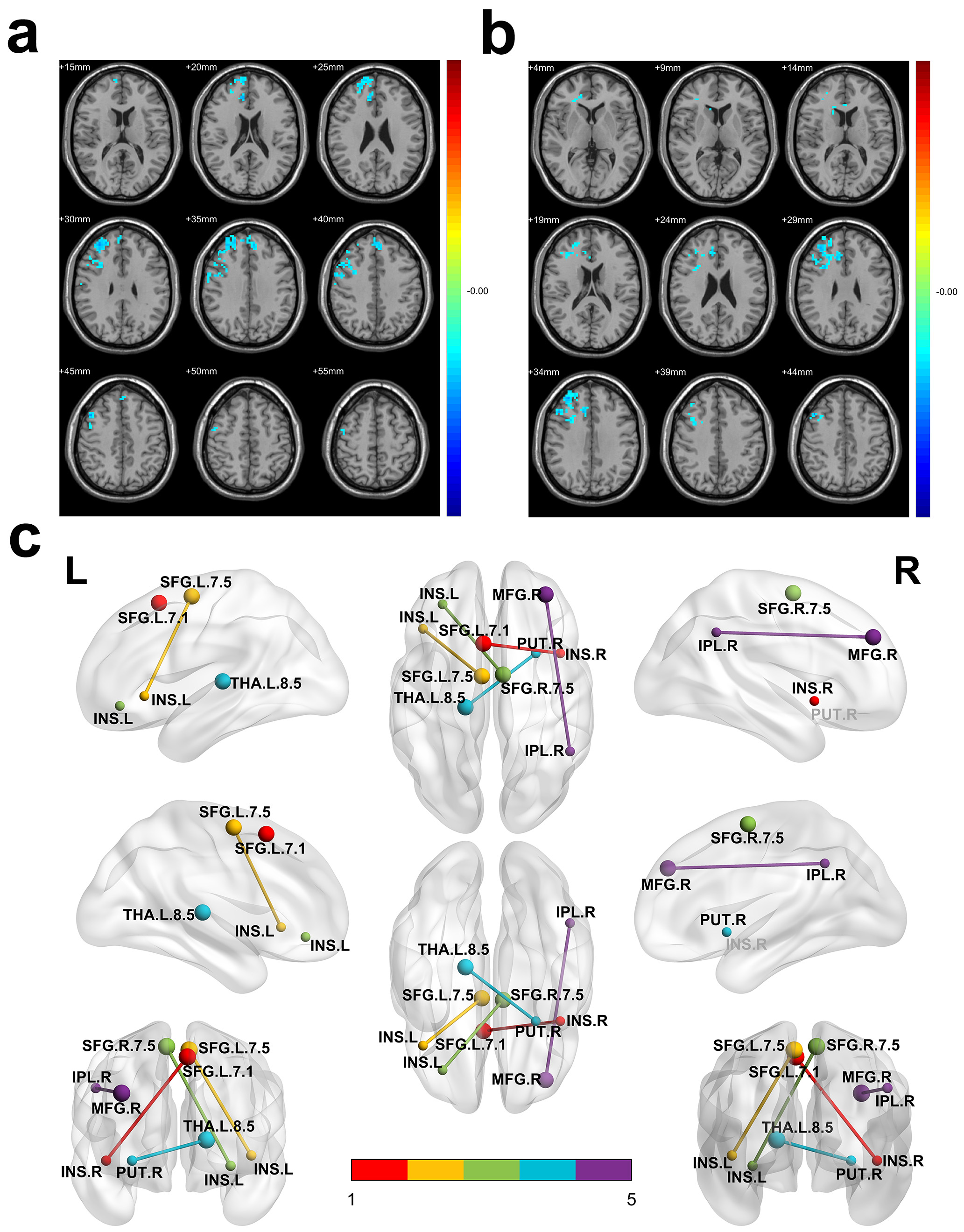 Fig. 4. Differences of ALFF, ReHo and FC in adolescents with depression before and after acupuncture treatment. (a) Compared with patients before acupuncture treatment, reduced ALFF values in the MFG.R, SFG.R, dlPFC.R and ACG.R were observed in patients after treatment. (b) Compared with patients before acupuncture treatment, reduced mKccReHo values in the MFG.R, SFG.R, dlPFC.R, ACG.R and CAU.R were observed in patients after treatment. (c) Compared with patients before acupuncture treatment, patients after treatment show two negative connections: between MFG.R and IPL.R (purple line), between THA.L.8.5 and PUT.R (blue line); and patients before treatment show three positive connections: between SFG.L.7.1 and INS.R (red line), between SFG.L.7.5 and INS.L (yellow line), as well as between SFG.R.7.5 and INS.L (green line). (a,b) Red and blue denote higher and lower ALFF or mKccReHo respectively and the color bars indicate the T value from two-tailed tests. ALFF, amplitude of low-frequency fluctuations; ReHo, regional homogeneity; mKccReHo, mean Kendall coefficient of concordance regional homogeneity; MFG.R, right Middle Frontal Gyrus; SFG.R, right Superior Frontal Gyrus; dlPFC.R, right dorsolateral Prefrontal Cortex; ACG.R, right Anterior cingulate and paracingulate gyri; CAU.R, right Caudate nucleus; FC, functional connectivity; IPL.R, right Inferior Parietal Lobule; THA.L, left Thalamus; PUT.R, right putamen; SFG.L, left Superior Frontal Gyrus; INS.R, right Insula; INS.L, left Insula.