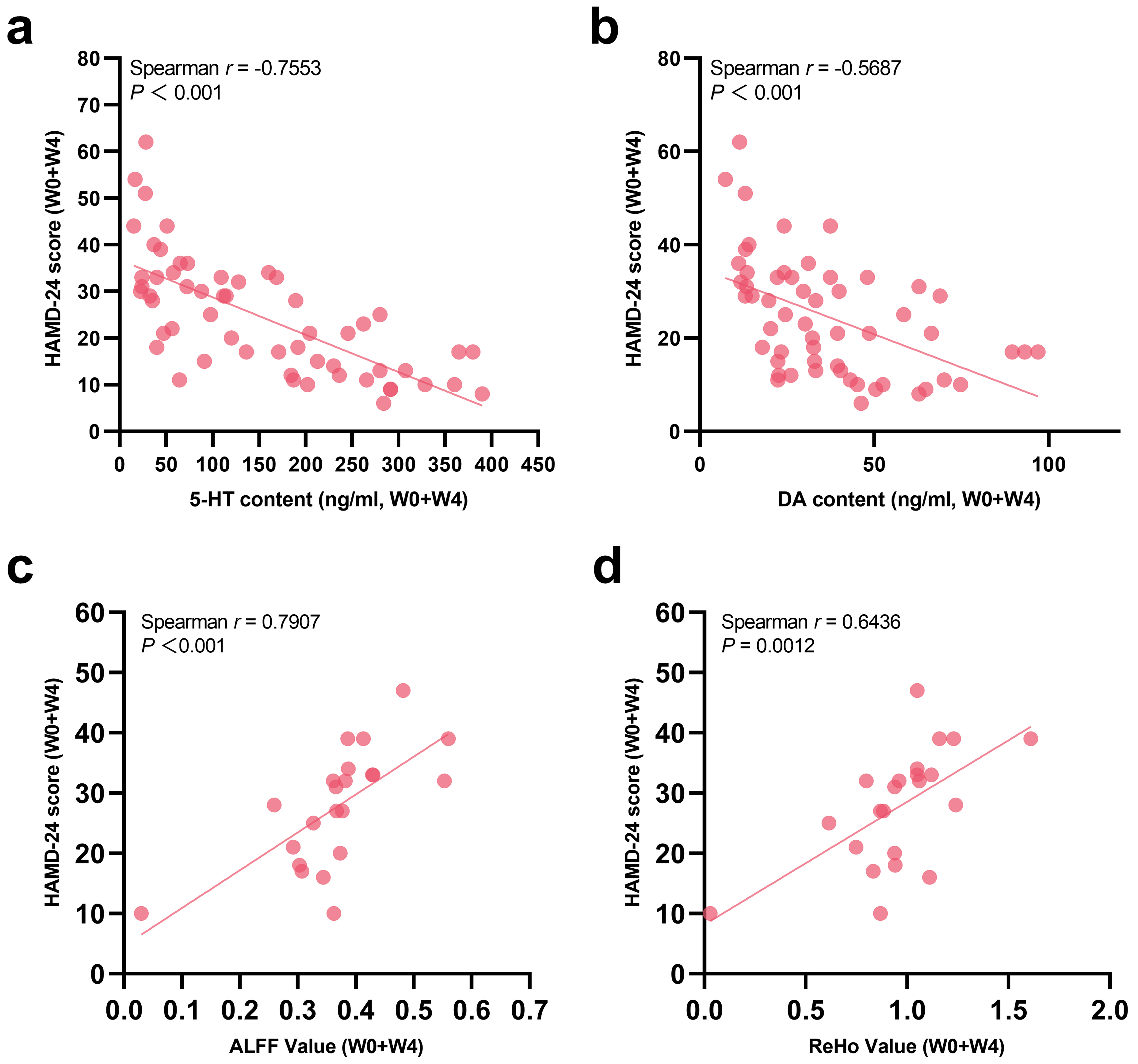 Fig. 5. Correlations between HAMD-24 scores and (a) serum 5-HT levels, (b) Serum DA levels, (c) ALFF, and (d) ReHo in adolescents with depression.