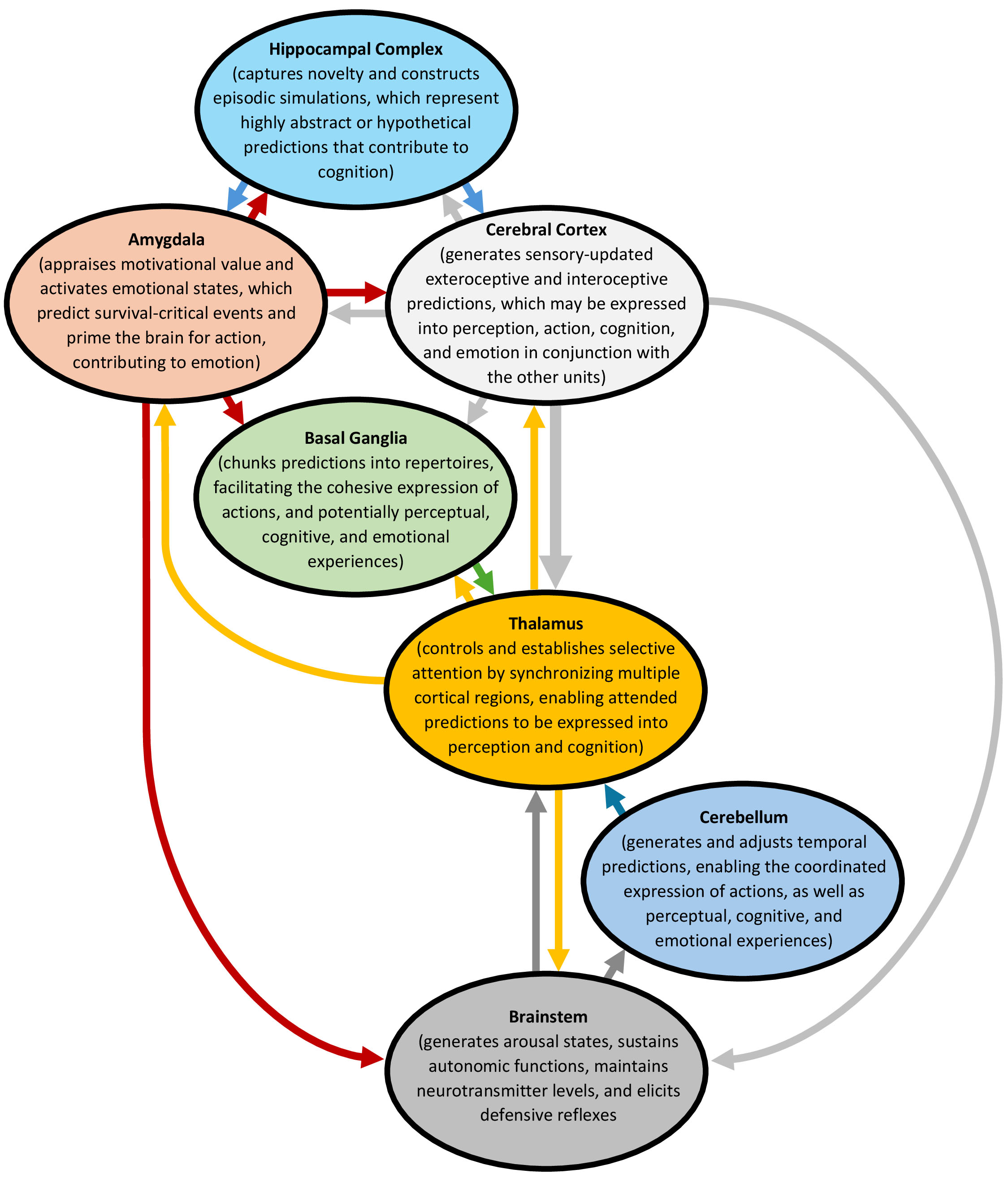 Accordingly, the brain can be viewed as an integrated system of semi-independent functional units, each of which contributes uniquely to predictive processing (Fig. 1). The cerebral cortex primarily drives this process by generating subconscious, sensory-updated predictions [18, 19]. However, the translation of these predictions into conscious perception, action, cognition, and emotion relies on specialized contributions from other units, as well as skeletal muscles and visceral processes. These collaborators include the thalamus, which controls and establishes attention, enabling states of thalamo-cortico-thalamic synchrony for the expression of conscious perception and cognition [20, 21]; the hippocampal complex, which captures novelty and constructs episodic simulations that represent highly abstract or hypothetical predictions, contributing to the conscious cognitive experience [22, 23]; and the amygdala, which appraises motivational value and activates emotional states that predict survival-critical events and prime the brain for action, contributing to a subjective emotional experience [24, 25]. During this translation, the basal ganglia and cerebellum contribute “sculpting” roles, with the basal ganglia chunking predictions into repertoires, facilitating the cohesive expression of actions, and potentially perceptual, cognitive, and emotional experiences [26], while the cerebellum generates and adjusts temporal predictions, enabling the coordinated expression of actions and experiences [27].