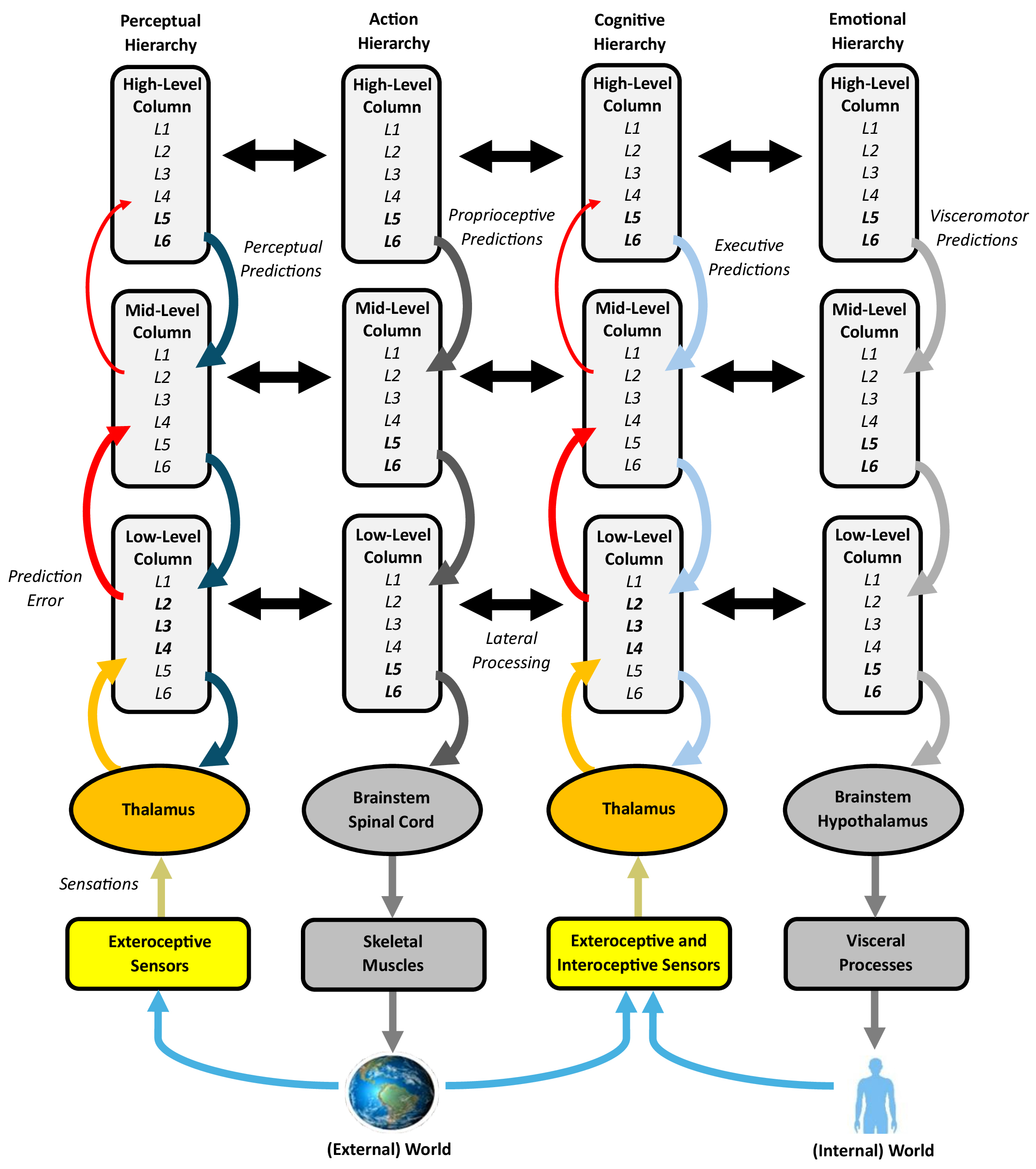 The cerebral cortex, as the core of predictive processing, generates sensory-updated exteroceptive predictions about the external world and interoceptive predictions about internal body states. These subconscious predictions may be expressed into conscious perception, action, cognition, and emotion in conjunction with other functional units, as well as skeletal muscles and visceral processes. Cortical processing occurs within the canonical circuitry of its “columns”, which are arranged into a series of processing hierarchies (Fig. 2).