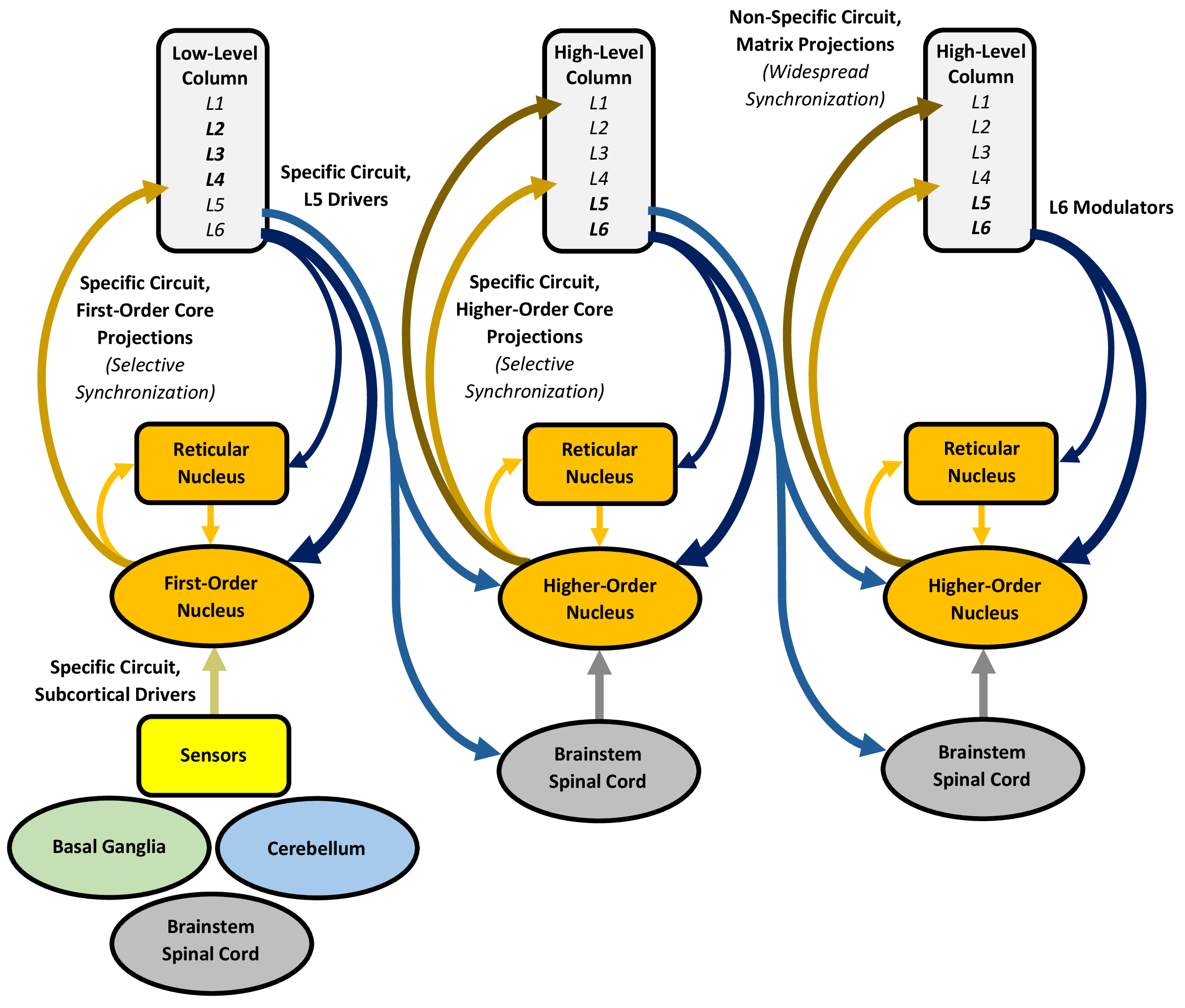 Fig. 3. Processing in the thalamus, with an emphasis on the specific and non-specific circuits. The specific circuit proceeds through drivers and core projections, giving rise to a trans-thalamic pathway that links multiple, spatially distinct regions of the cerebral cortex, whereas the non-specific circuit proceeds through the more diffuse matrix projections (in the columns, bolding represents more well-developed layers). Both circuits are influenced by enormous numbers of modulators. The reticular nucleus controls selective attention by inhibiting the other thalamic nuclei, relaxing this inhibition for novel or motivational information, including predictions, to establish selective attention. Enhanced activity in the specific circuit selectively synchronizes multiple, separate cortical regions at local and long-range scales, whereas non-specific circuit activity promotes widespread cortical synchronization. The ensuing thalamo-cortico-thalamic synchrony may serve as the primary physiological basis for expressing predictions into conscious perception and cognition, with gamma synchrony binding and expressing the predictions of the activated columns into a conscious, unified experience, modulated by lower-frequency synchrony. The figure was created using Microsoft Word 365.